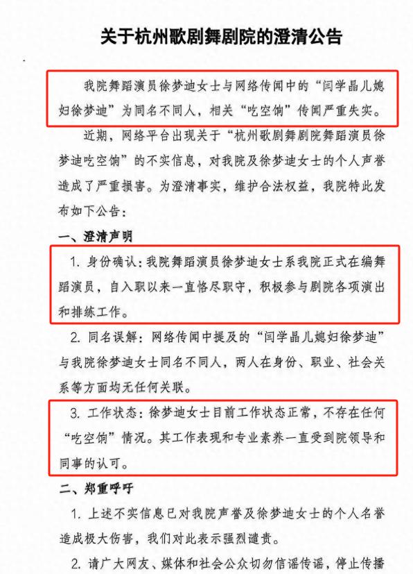 主要是杭州歌剧院有个叫徐梦迪的,是有“铁饭碗”的,而徐女士却总跟着婆婆直播带货,也不去公演,