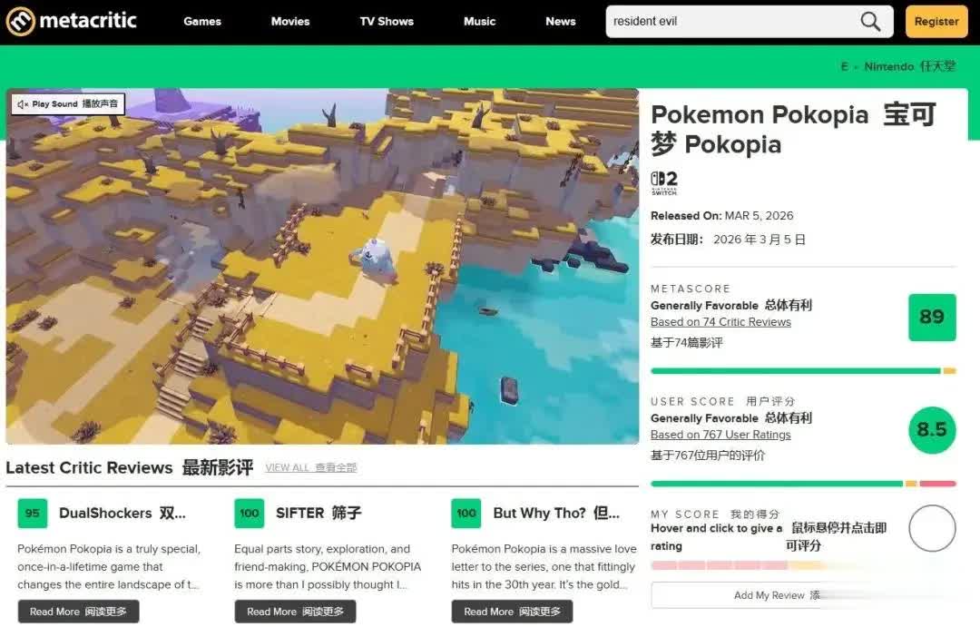 《宝可梦Pokopia》5天内成为除同捆游戏《马里奥赛车:世界》外,最快达成百万销量的NS2游戏,一周销量达到220万。M站平均分数达到89分,居然压过了《宝可梦朱/紫》等正统作品,品质可见一斑。
