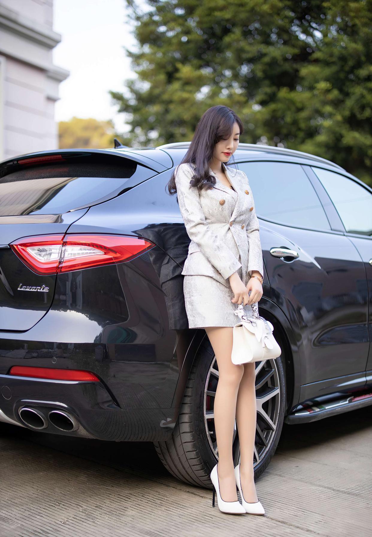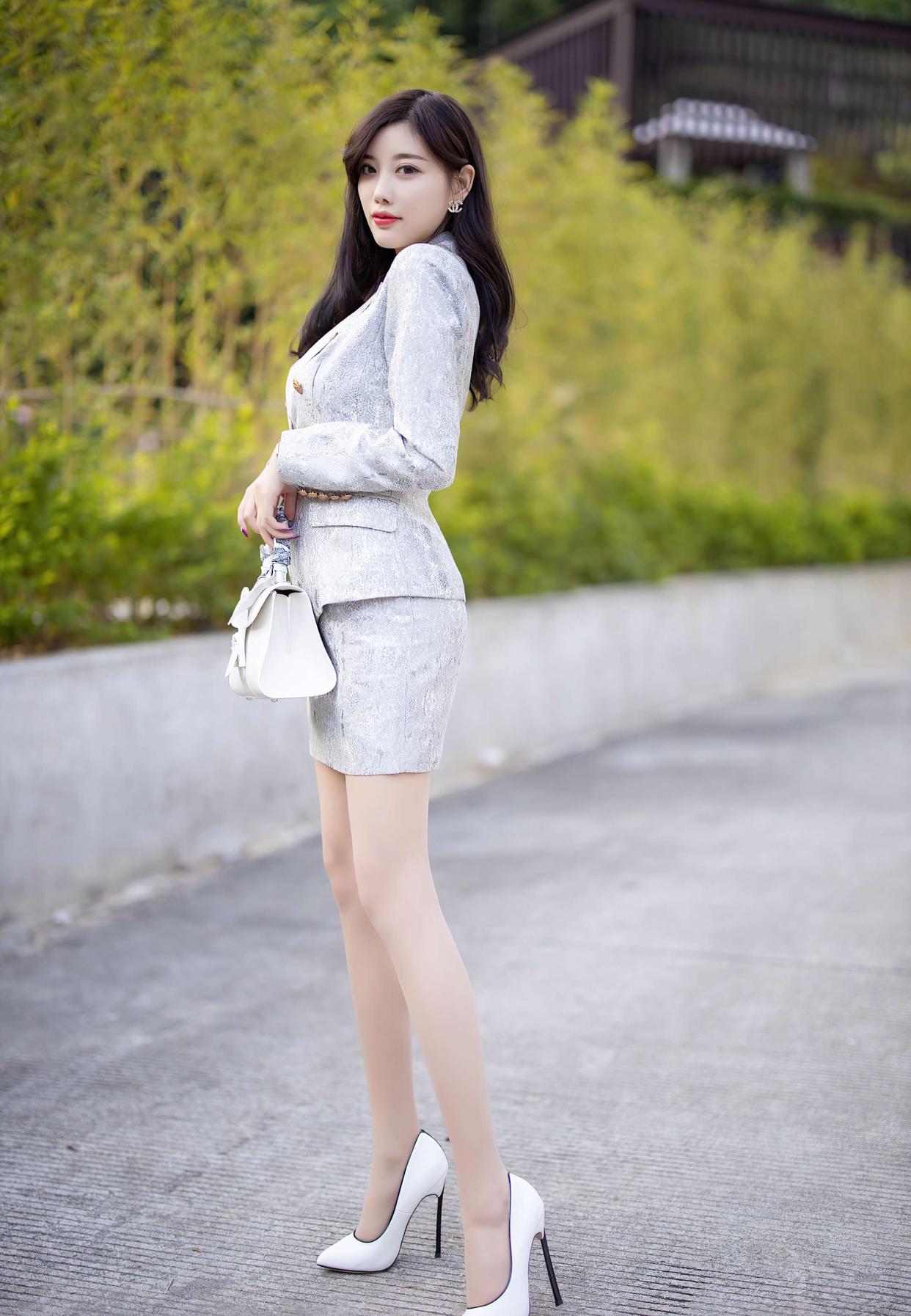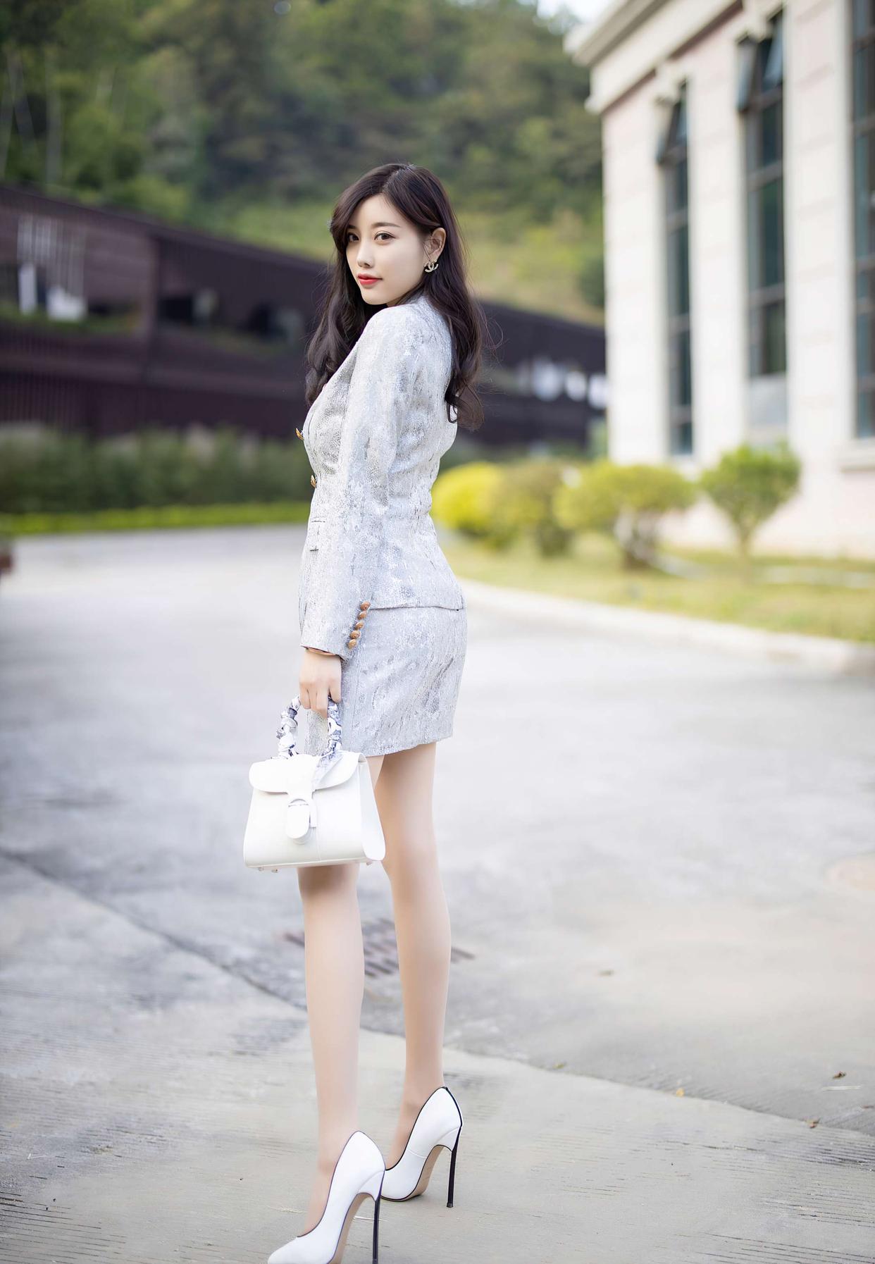 搭配一双简约的白色尖头高跟鞋,利落又优雅,和银灰色系呼应起来特别和谐;再拎一只白色小方包,整体配色干净又显贵,低调中透着精致感~