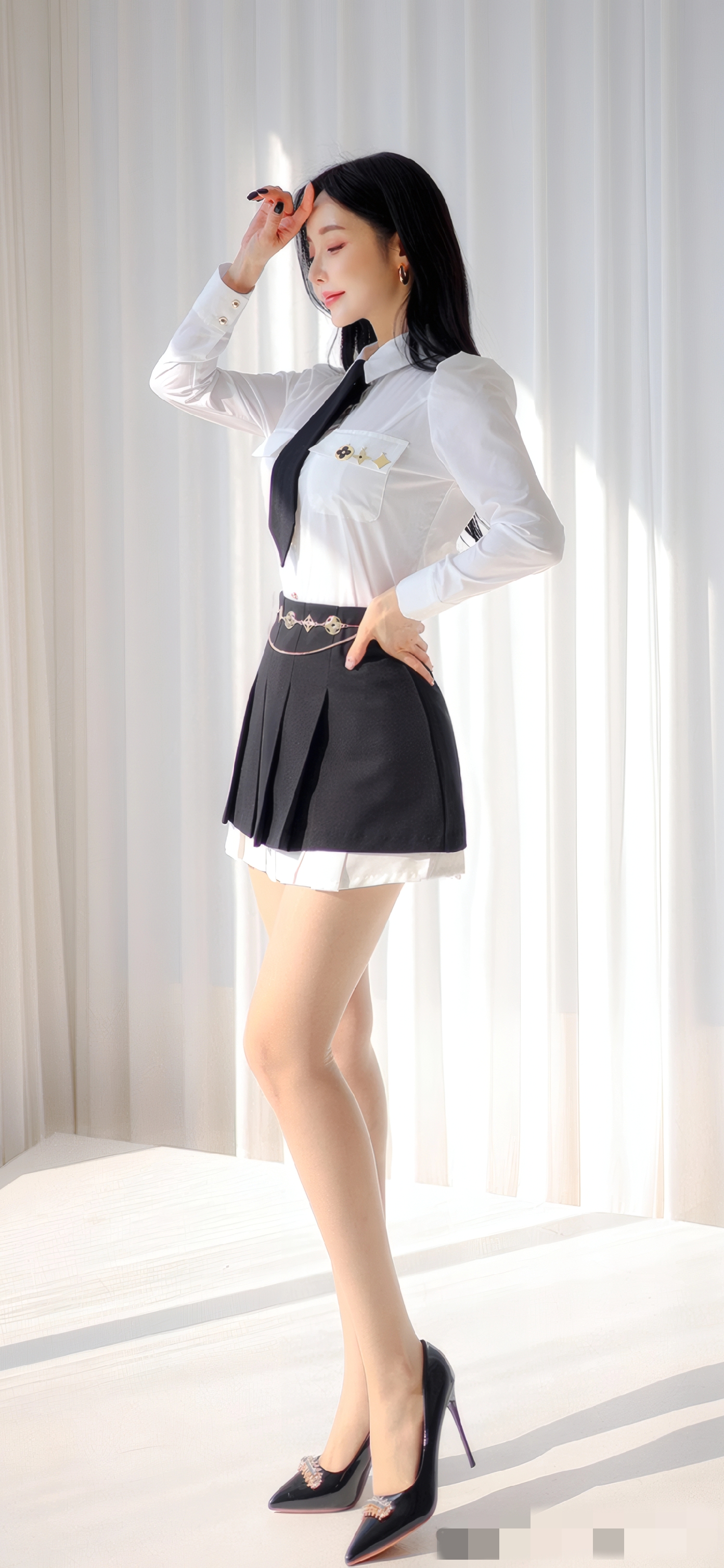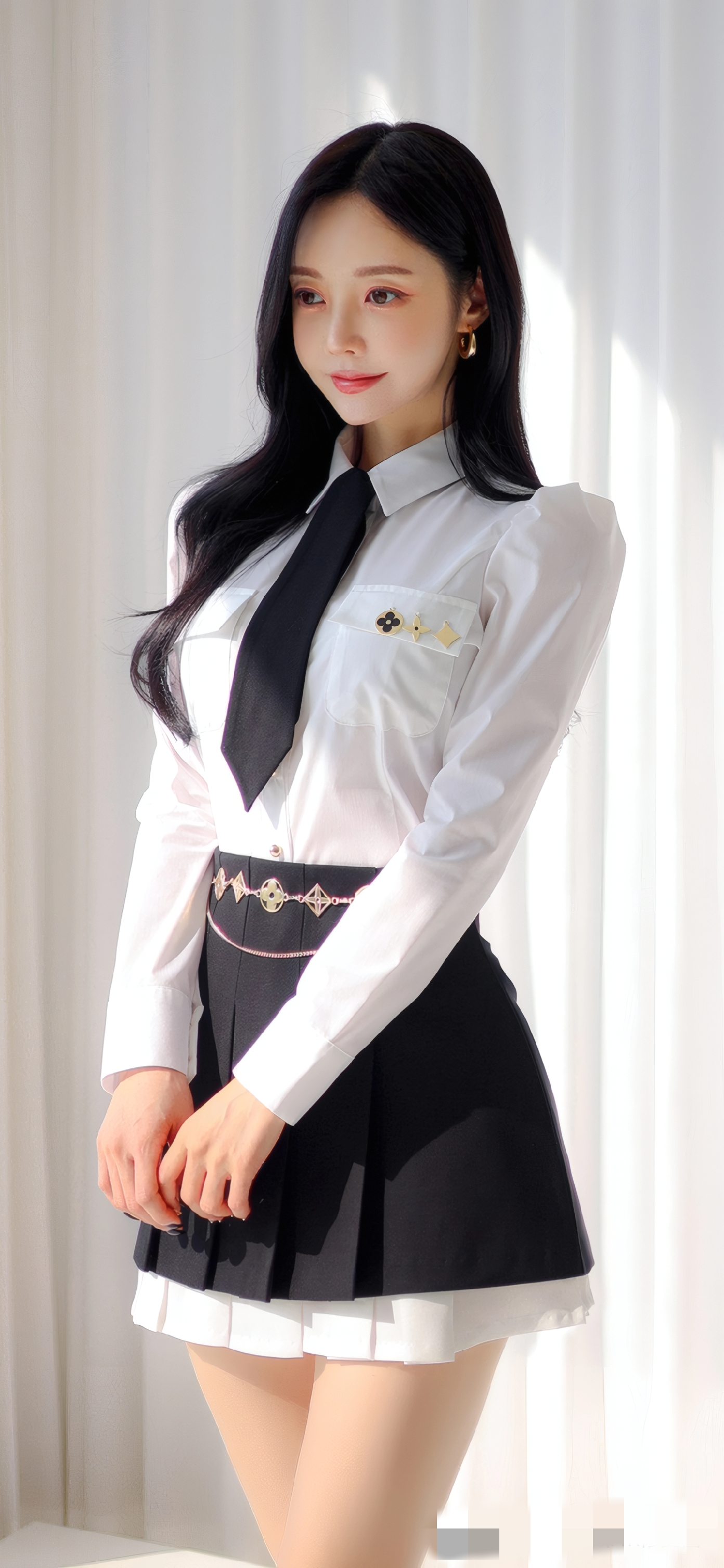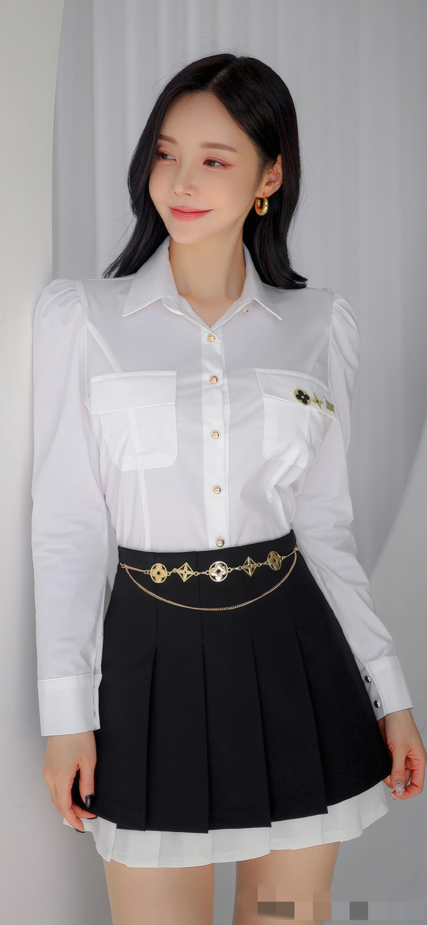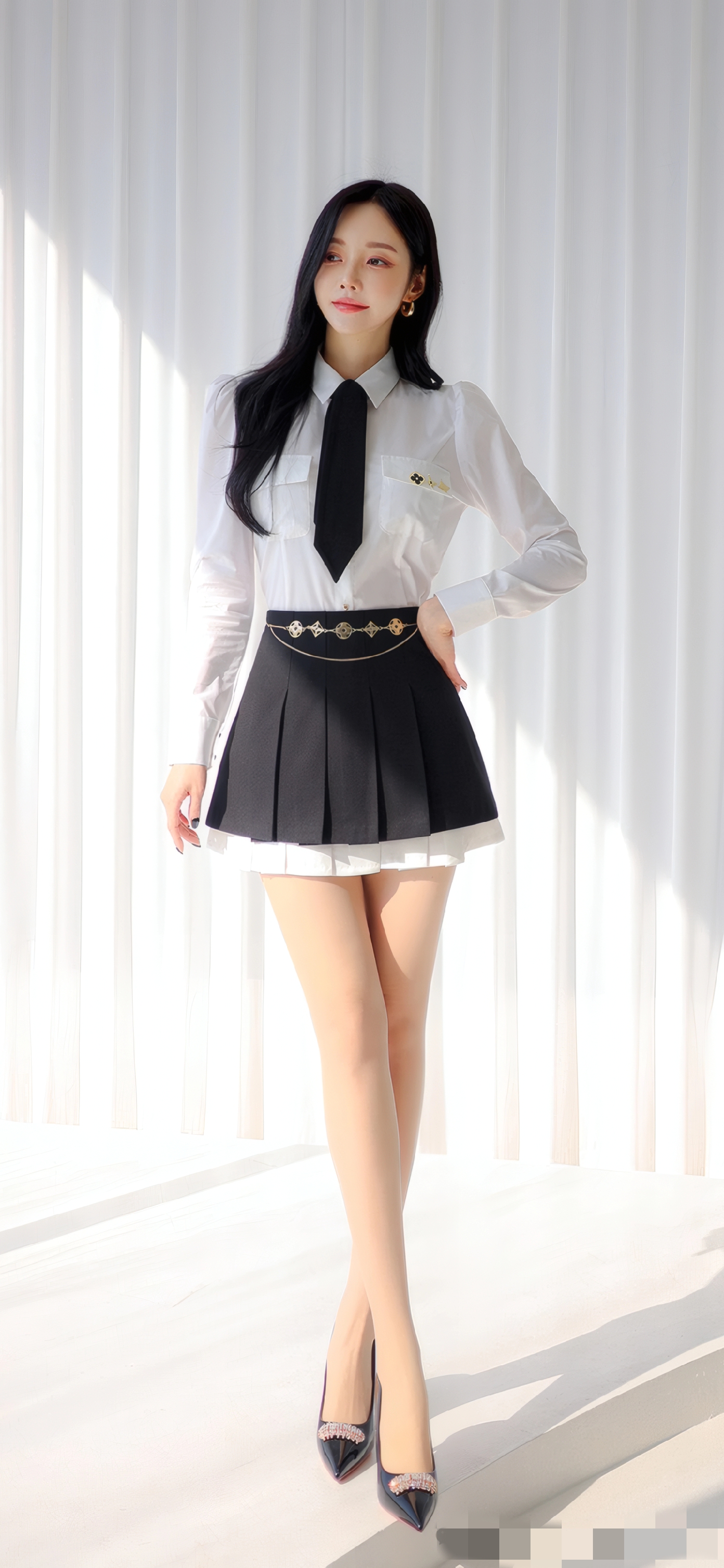 2. 黑裙搭配重点:长度选「膝上3cm」(显高不暴露),百褶裙优先选「细密褶」(质感更高级),搭配「可拆卸链条腰饰」(收紧腰线,提升造型感),裙摆带隐形内衬(避免走光)。