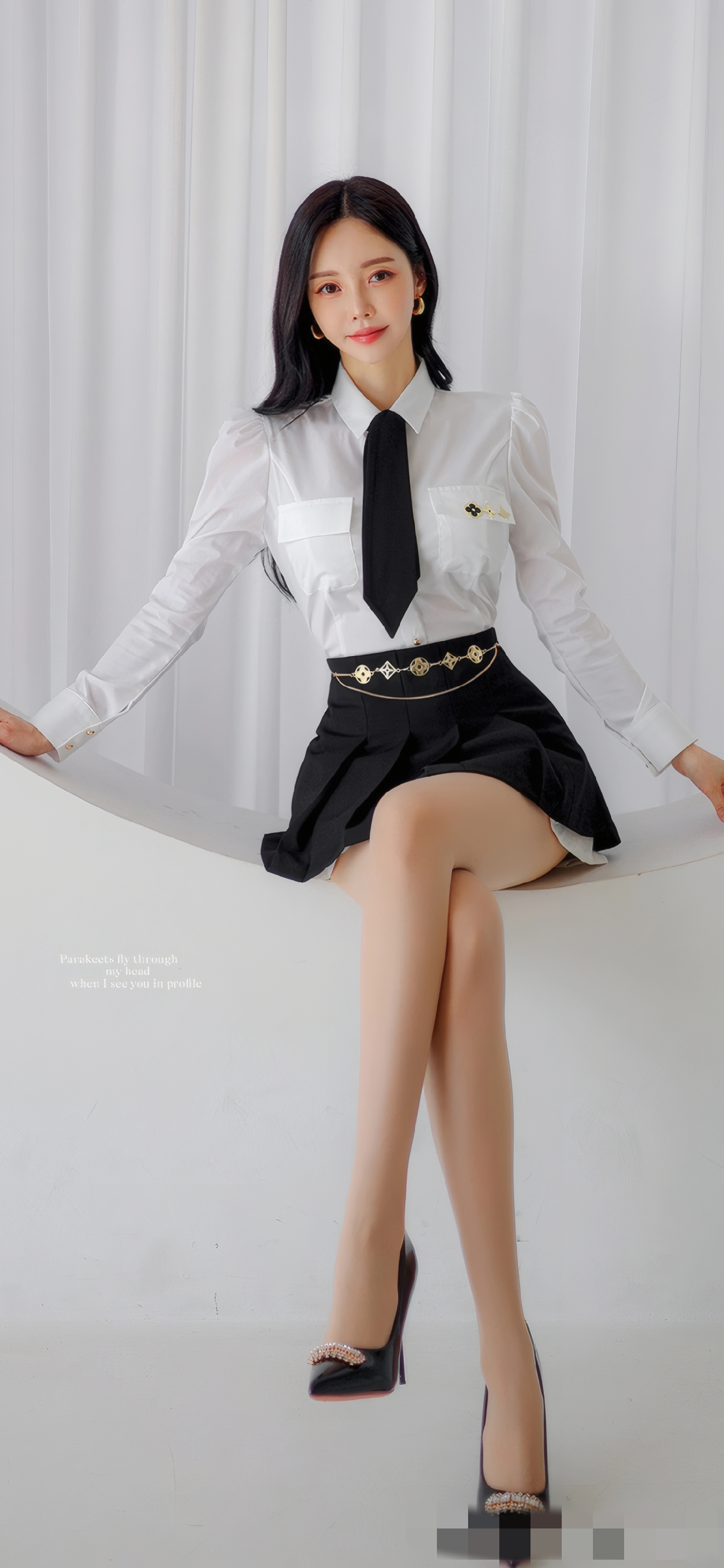 图里这套穿搭把“细节控”狠狠拿捏了:衬衫加了泡泡袖+金属装饰,打破刻板的通勤感;黑裙配链条腰饰,甜妹瞬间带了点酷飒劲儿;再踩一双带钻高跟鞋,温柔和精致直接拉满~