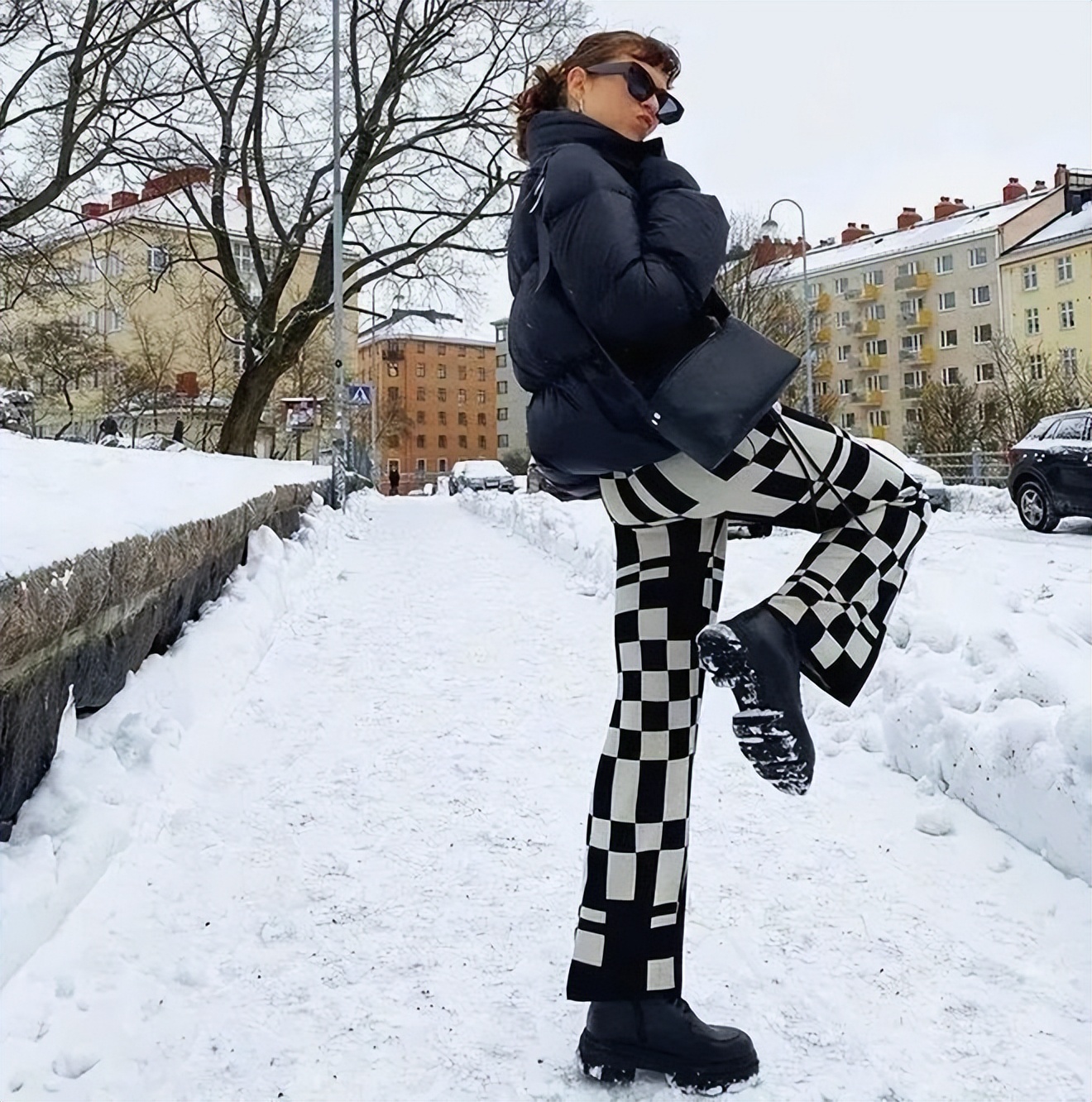 高腰的微喇裤设计在视觉上拉长身高,搭配马丁靴,还可以削弱厚外套的臃肿感,将复古又性感发挥到了极致~