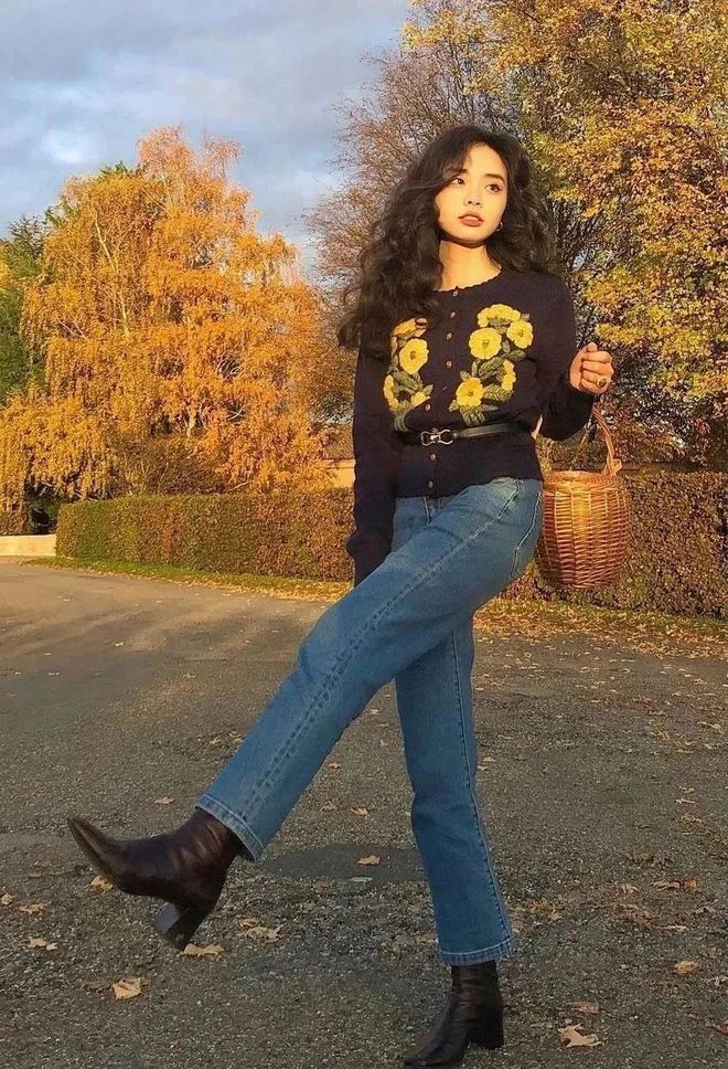 高腰的直筒裤,搭配一双踝靴,视觉上身材比例更佳。