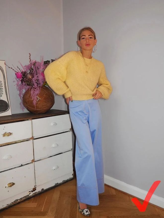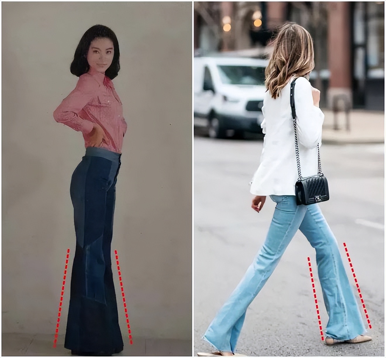 相对“大喇叭”,膝盖以下裤管向外打开的小一些的微喇裤,不会被拉低重心,避免把人“压扁”的风险。