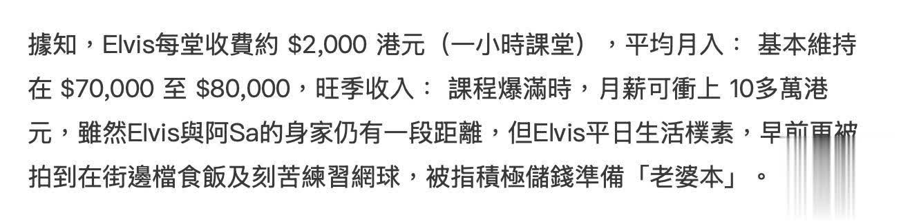 私人教练在香港收入不低,星级教练更是如此。他们直接对接明星、名人这类不缺钱的客户,口碑好则客户不断。林俊贤在中环顶级健身馆担任星级私教,外形健硕、专业知识丰富且年轻,深受圈内人士欢迎,关智斌也是他的学员。他每小时收费2000元,每月基本收入至少七八万,课时常爆满,旺季收入超10万,年平均月薪10万左右。虽与蔡卓妍收入差距大,但养家糊口绰绰有余。
