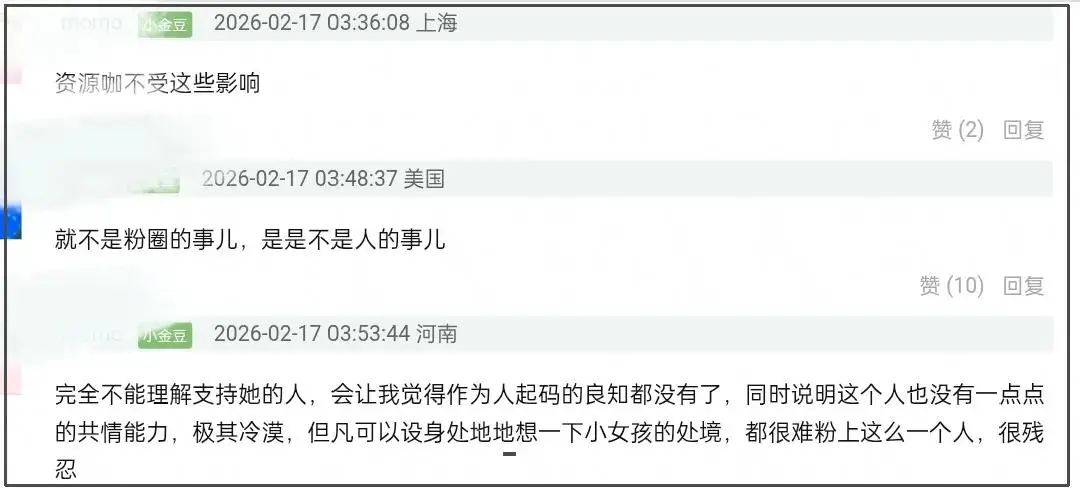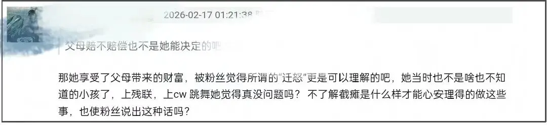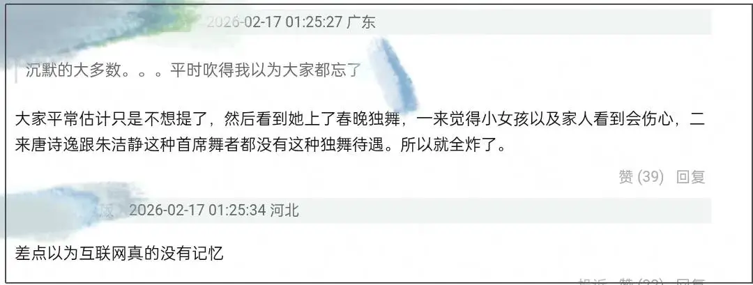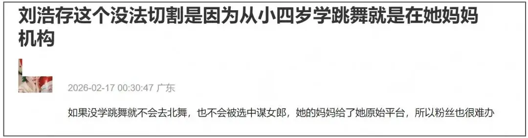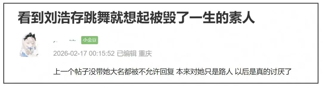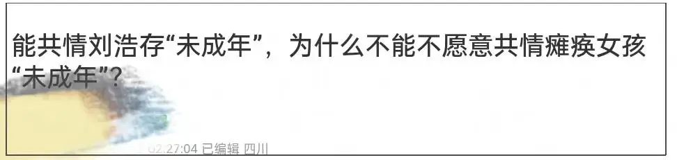 而看到刘浩存跳舞便自动激发另一个话题——那个一生被毁了的素人女孩。当年,刘浩存父母致小女孩一级伤残事件,大多数人并不清楚其中的细节,所以会有“刘浩存父母的错,跟她有什么关系,她也被连累了”的声音,这种只能共情“刘浩存未成年”的言论也引起了一些不满。