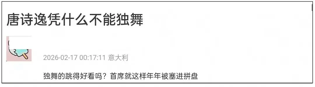 唐诗逸、朱洁静都是专业的首席舞者,一般来说,比业余舞者更适合独舞。实际是刘浩存有独舞,朱洁静领舞没镜头,唐诗逸直接被塞进拼盘大杂烩里,完全浪费,所以网友炸了。