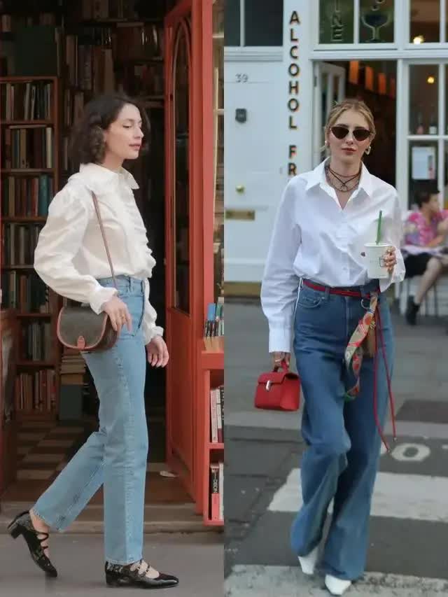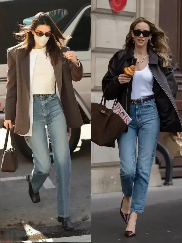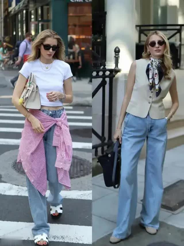 天气变得暖和,咱们就可以摆脱冬季的臃肿穿搭了,用一件白色的短袖 T 恤或者是无袖短款马甲,搭配上牛仔直筒阔腿裤,就能形成上短下长的搭配公式,可以形成高腰线,使得身材变成三七分的比例,让我们普通大众也能拥有大长腿。