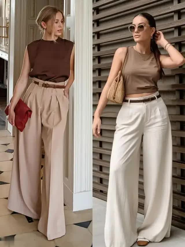 就算是为了能很好地遮住身材的缺点和腿部缺点,我们选择的阔腿裤版型大小也要适中,不能过大,太大的话会显得拖沓邋遢。个人更推荐像上面这样的直筒阔腿裤,上身效果能让你拥有大长腿。