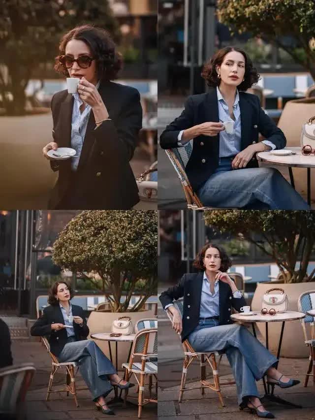 或是选一件浅黄色的西装,内搭白 T 恤,加上牛仔阔腿裤,这样的衣服配色很自然地让穿搭者显白显嫩,干练又不失精致感。