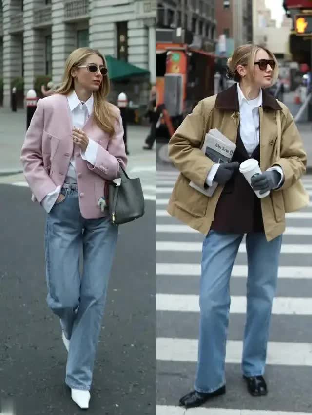 同样穿的是一条蓝色的牛仔直筒裤,但当我们的上衣不同,气质也有些改变。选择粉色的小香风外套,内搭白色衬衫,加上蓝色的牛仔裤,这样的穿搭精致洋气。
