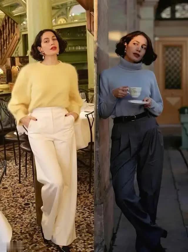 但是当我们换成阔腿裤,直筒裤就完全不同了,包容性很高,例如,我们可以选择白色的西装阔腿裤搭配上浅黄色的毛衣,脚踩黑色浅口单鞋,既遮肉又显洋气。