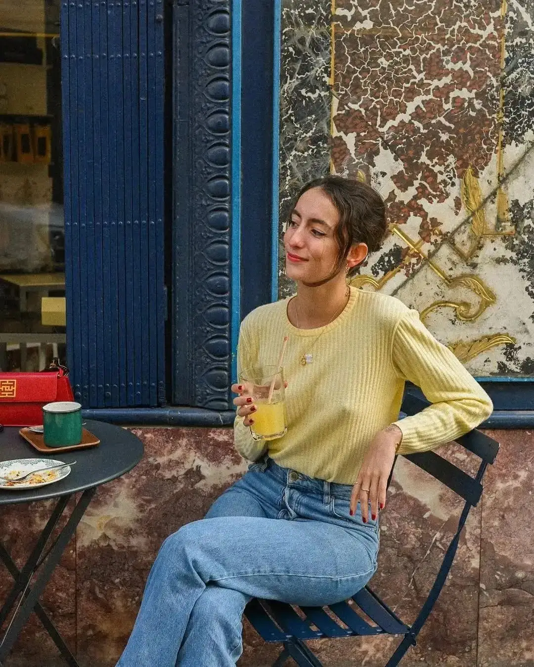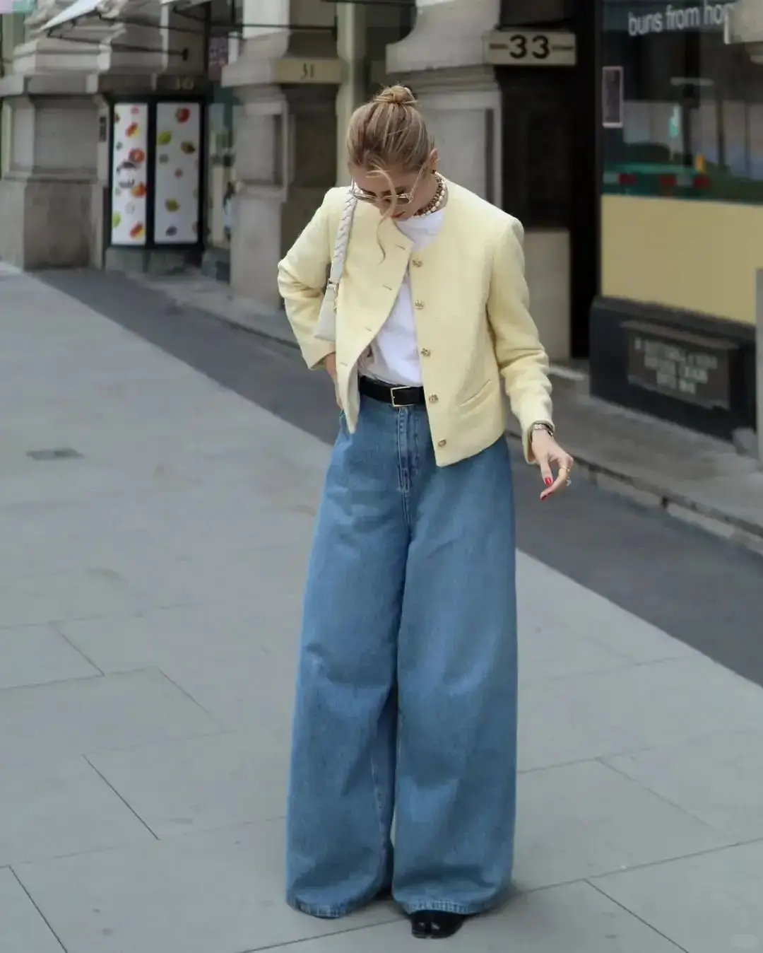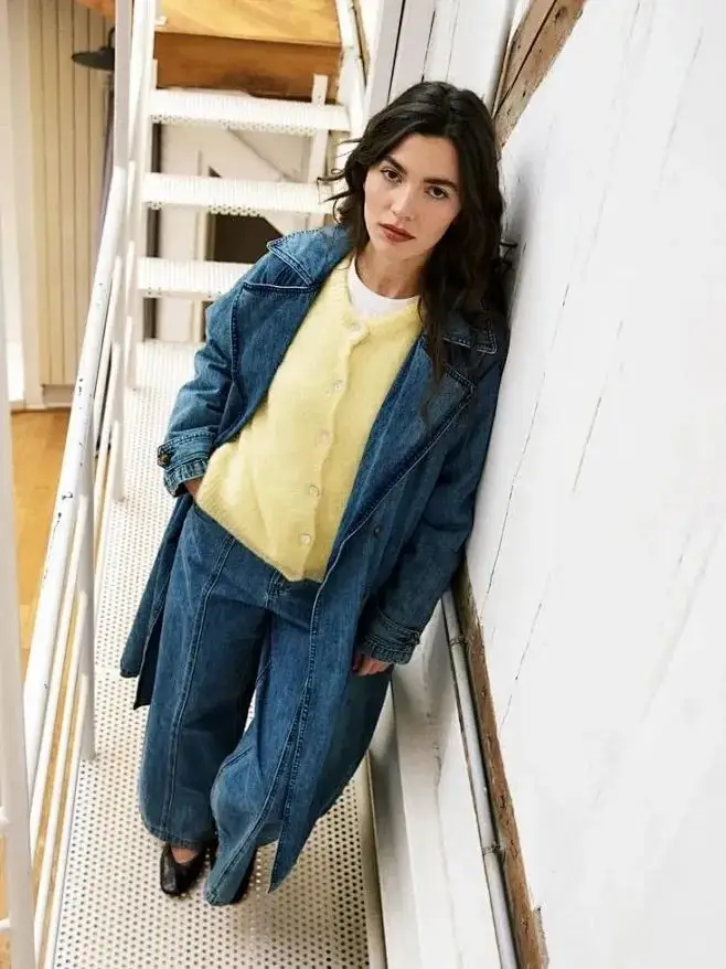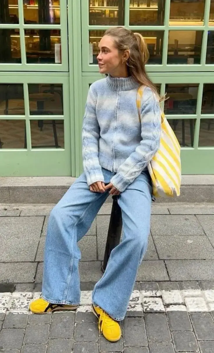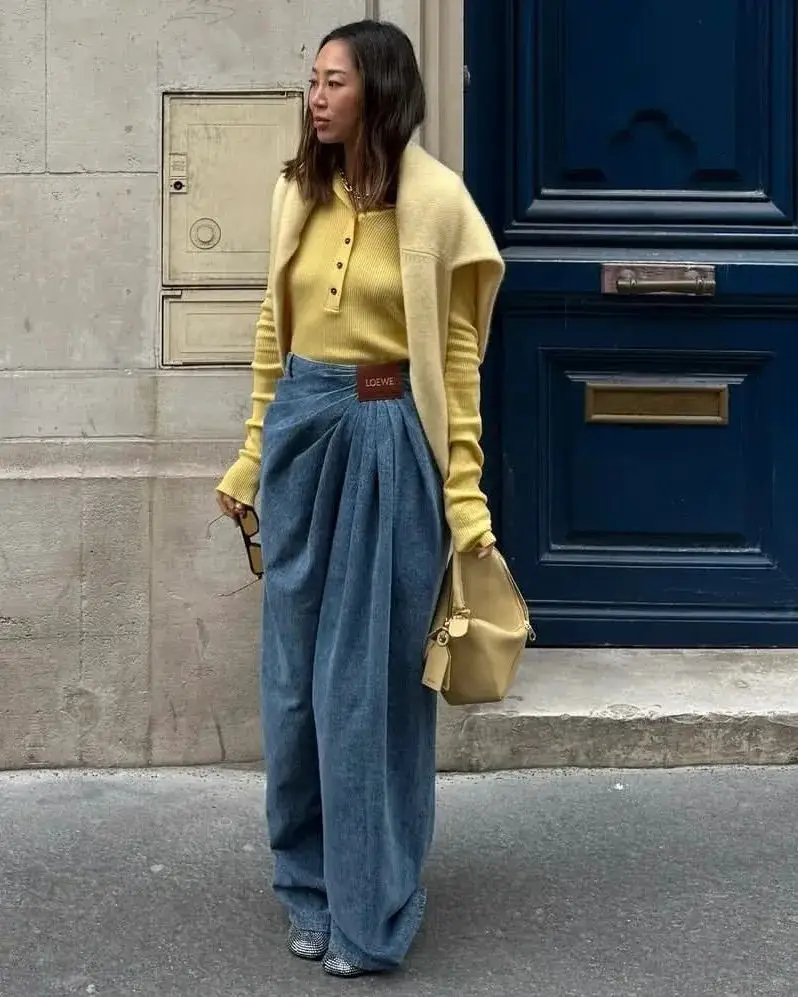 复古蓝色牛仔裤带有一种怀旧感,与浅黄色的温柔相结合,可以营造出一种轻松休闲又不失时尚感的风格。