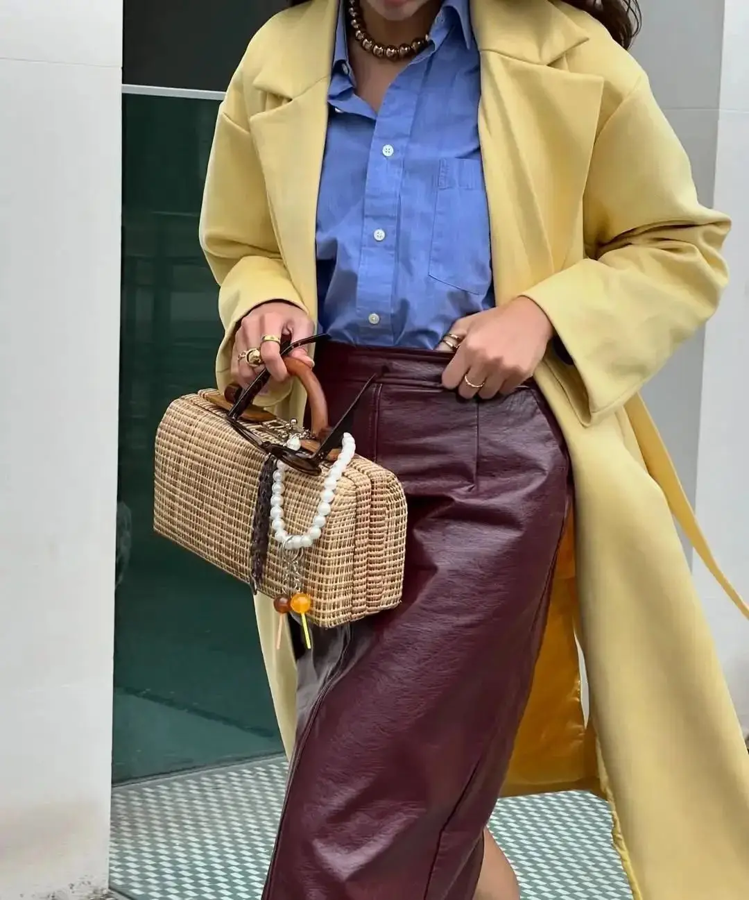 黄色大衣和蓝色衬衫的对比色搭配能够带来活力和视觉冲击,而酒红色皮裙则为整体造型增添了一丝优雅和神秘感。