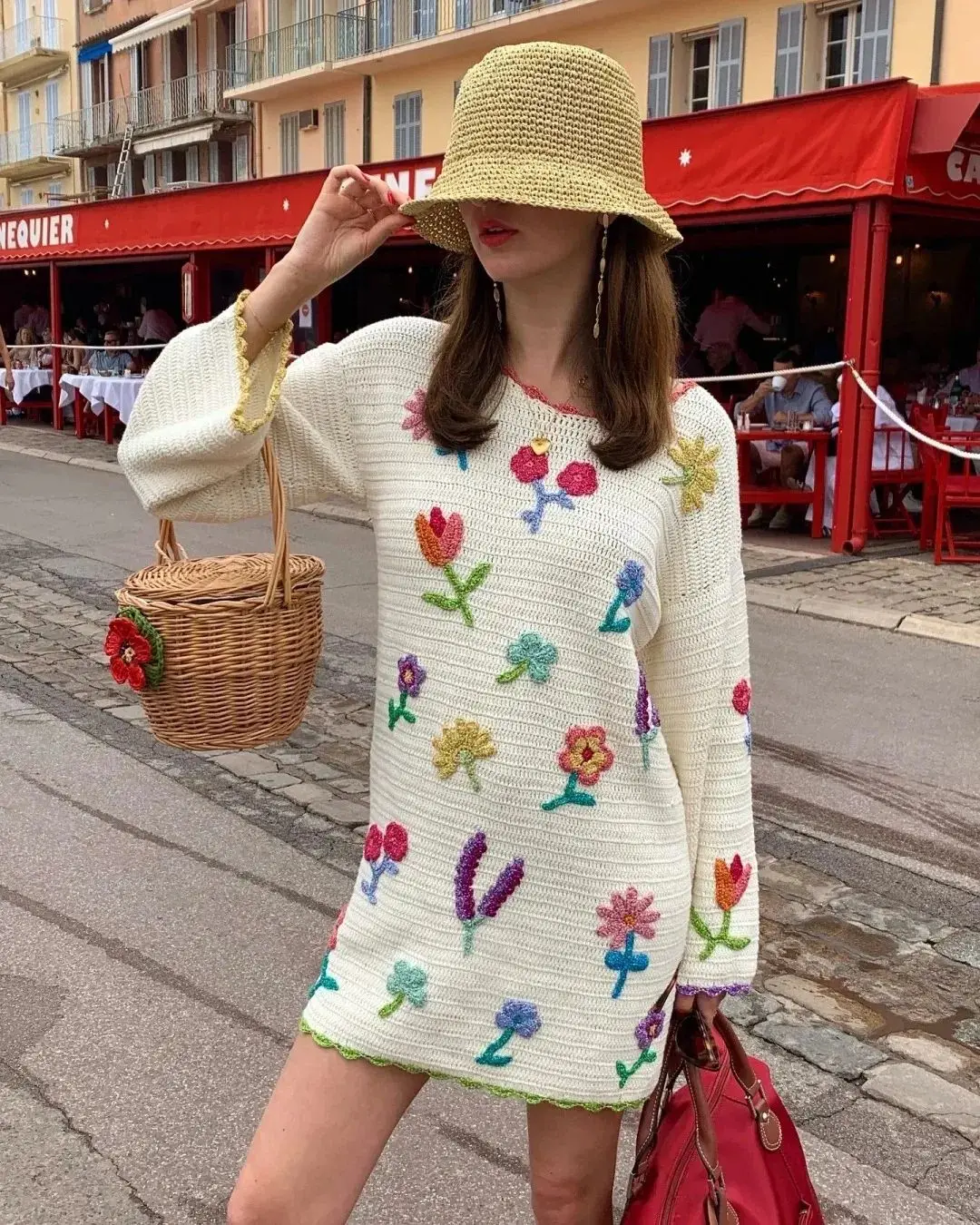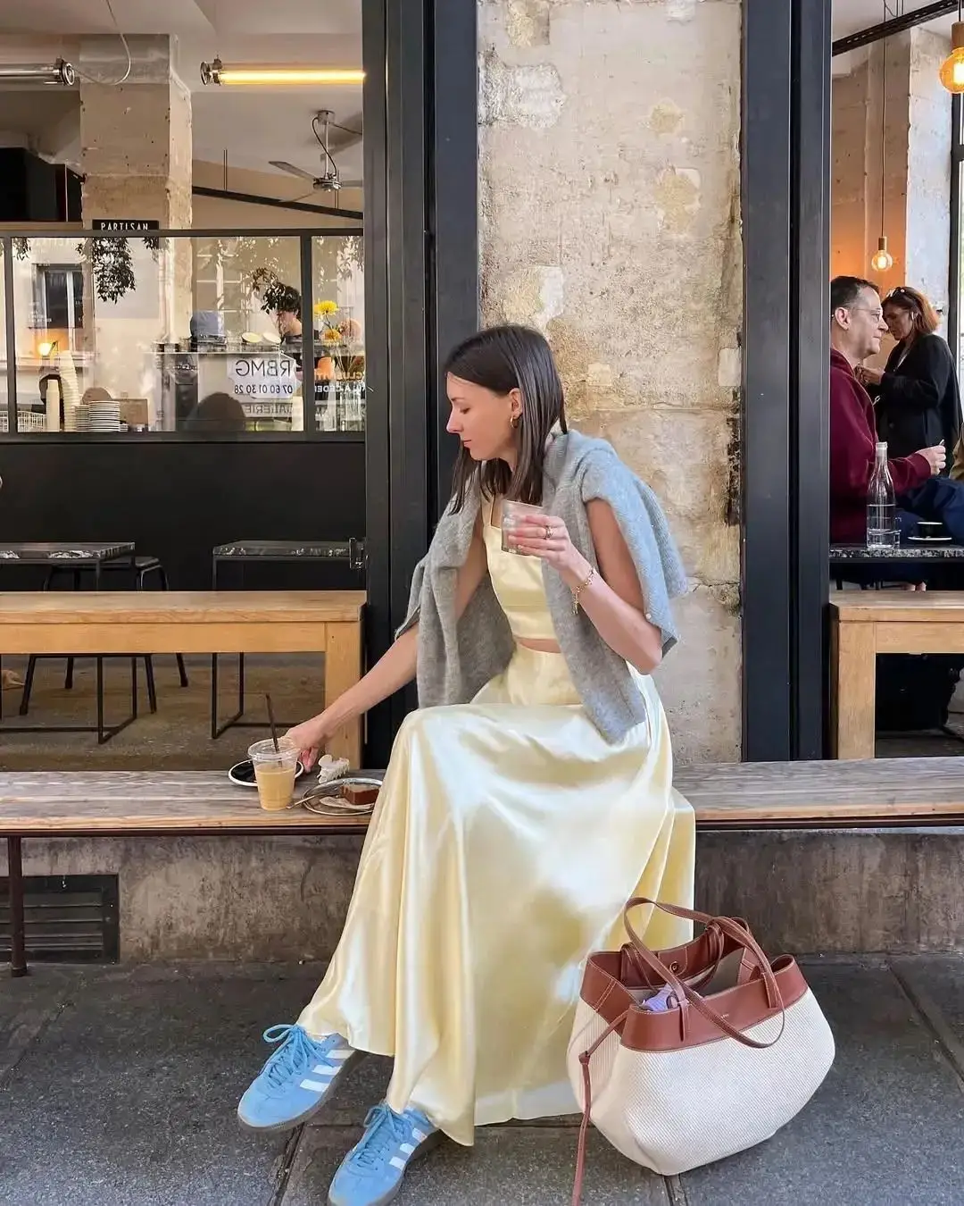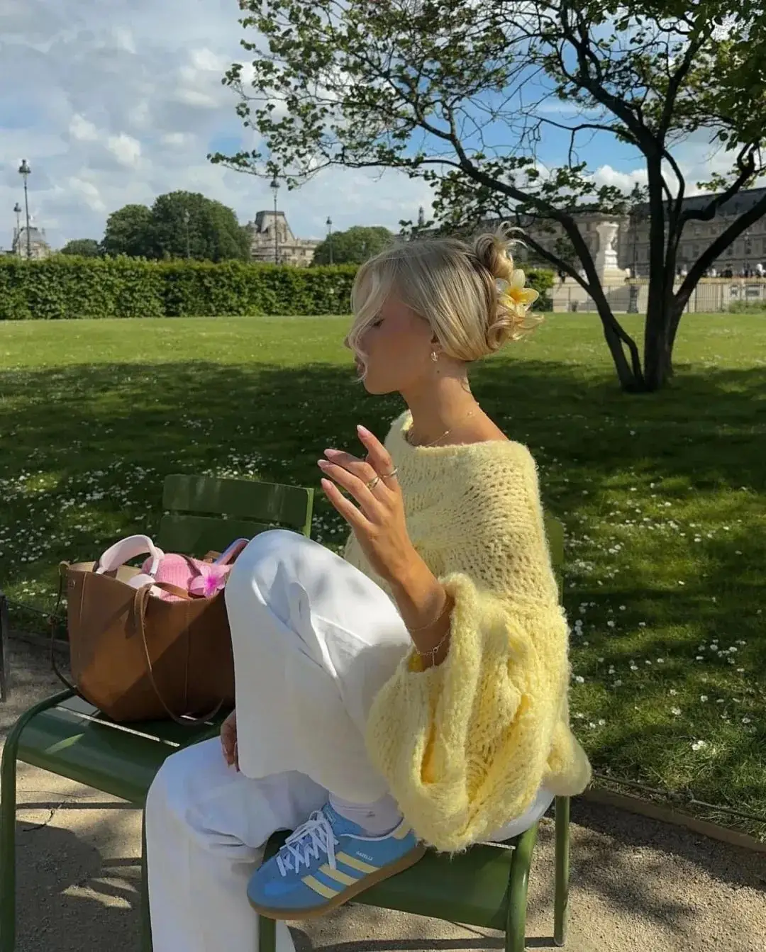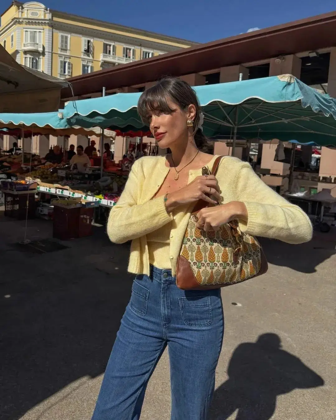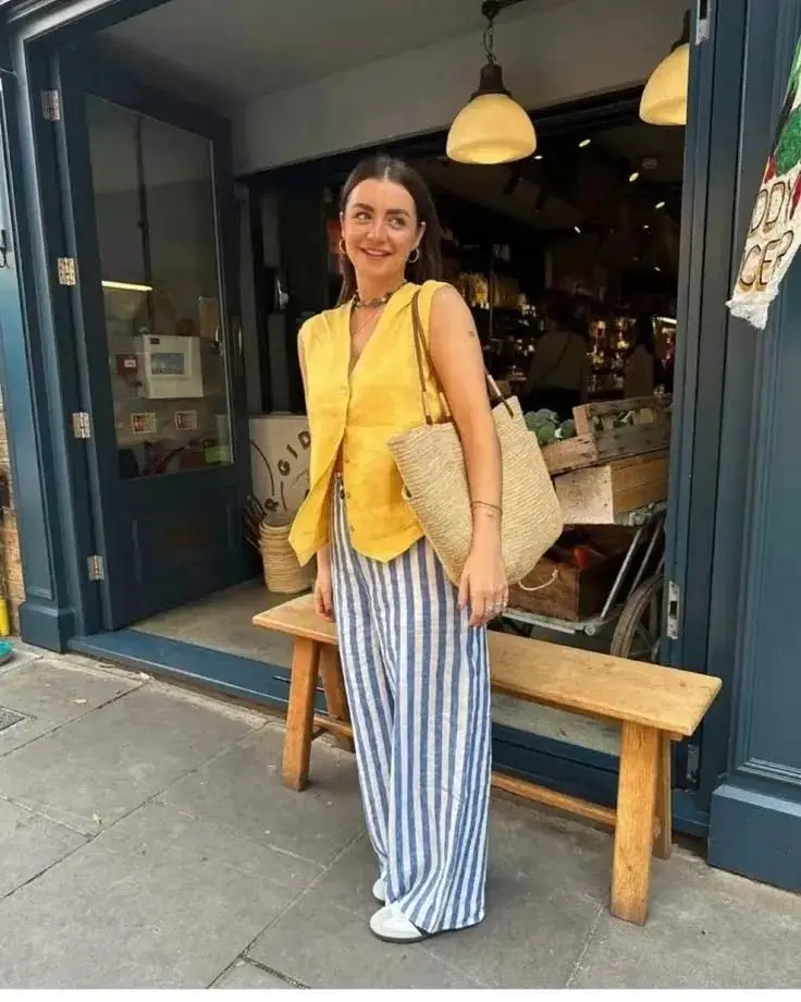 黄色马甲为整体造型增添了一抹明亮色彩,而蓝白条纹的阔腿裤则带来一种清新、复古的感觉。编织菜篮包则增添了一份田园风情。