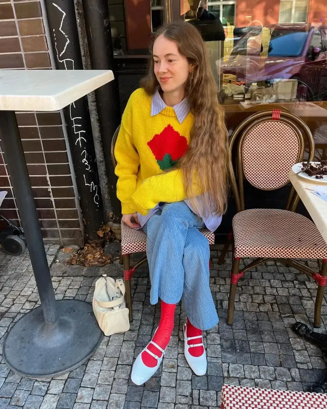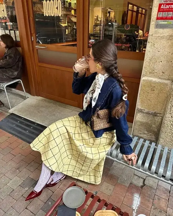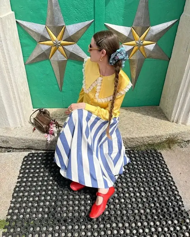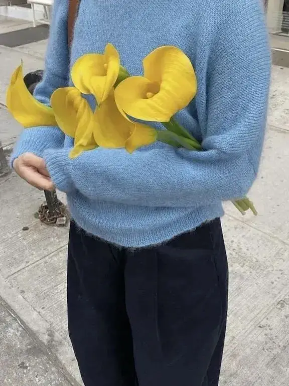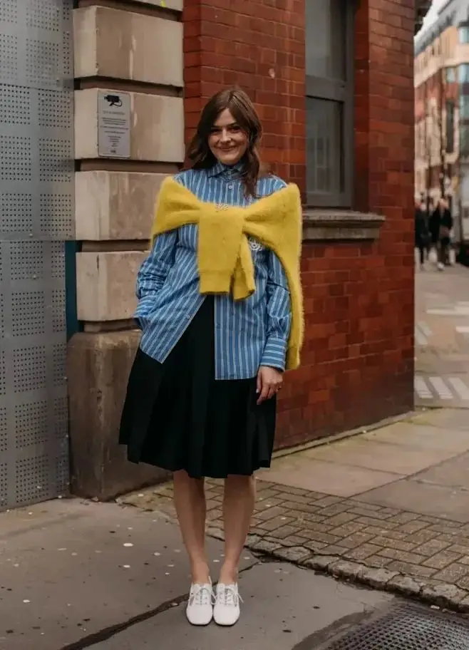 如果是饱和度更高的姜黄色毛衣,可以搭配一条复古蓝牛仔裤,毛衣里面叠穿一件蓝色条纹衬衫,露出衬衫领口、衣摆,正好与蓝牛仔、蓝色玛丽珍鞋呼应起来。