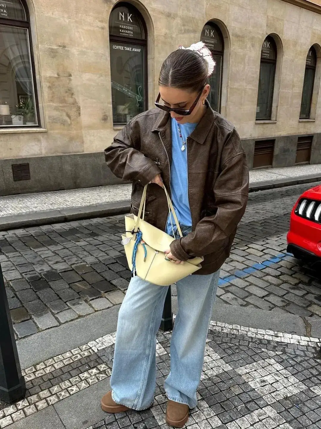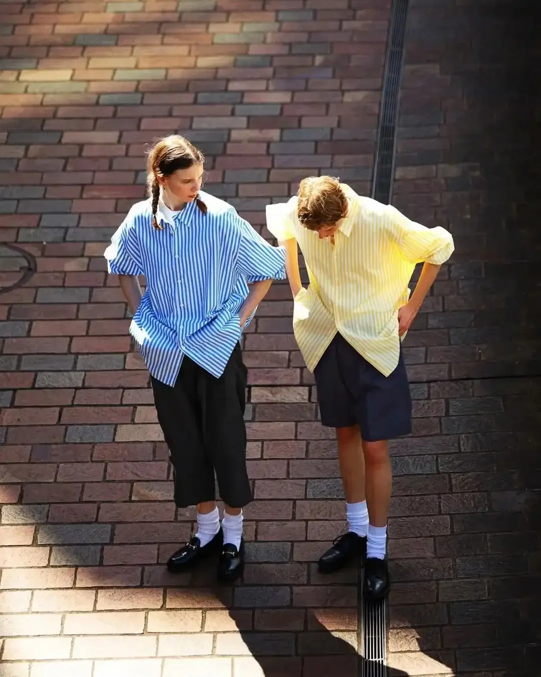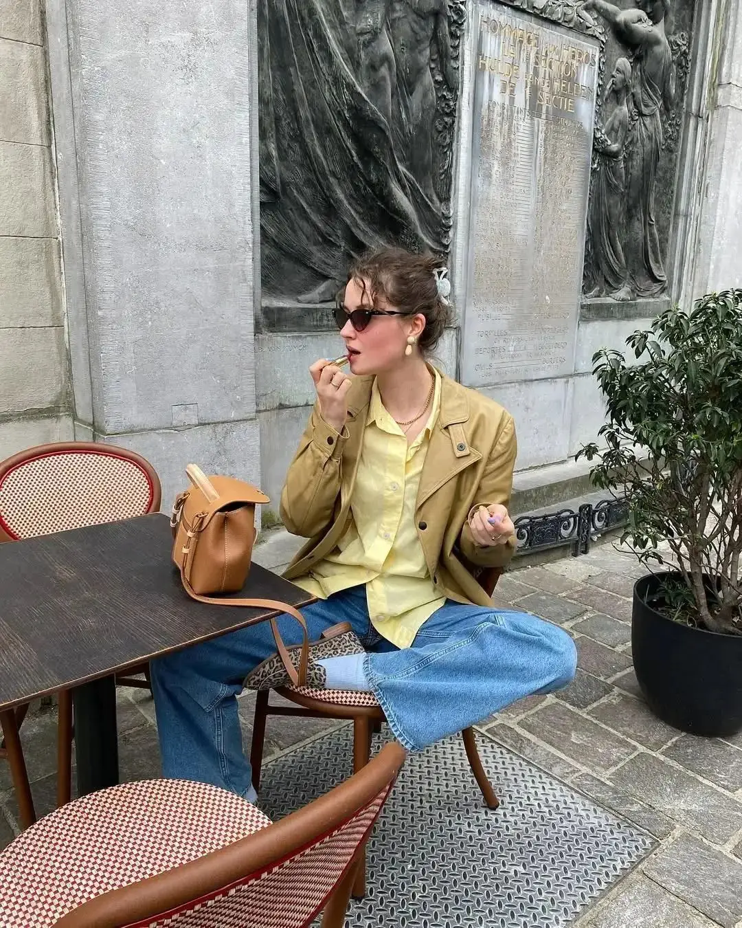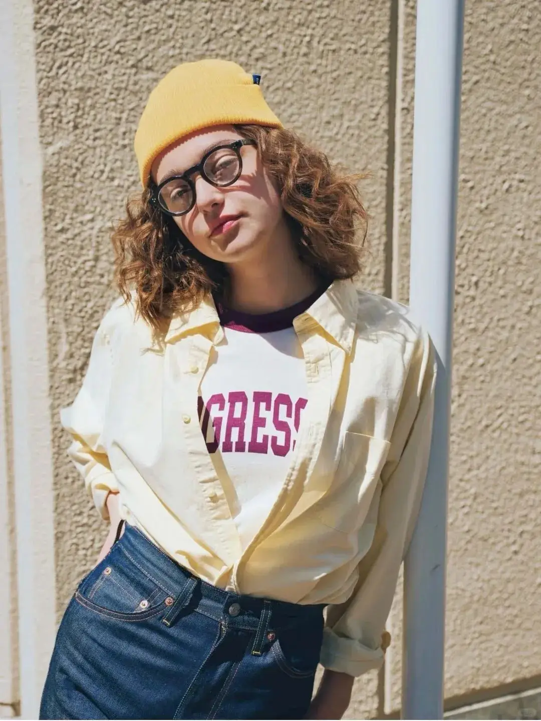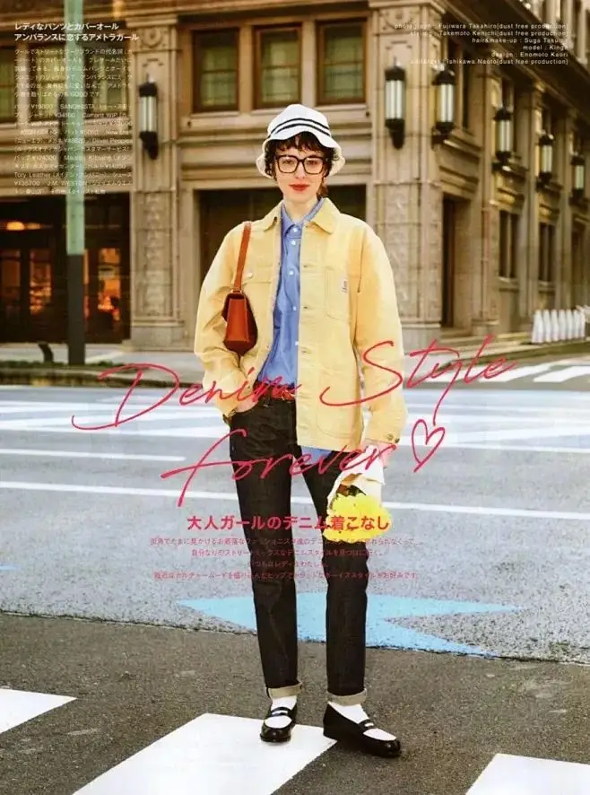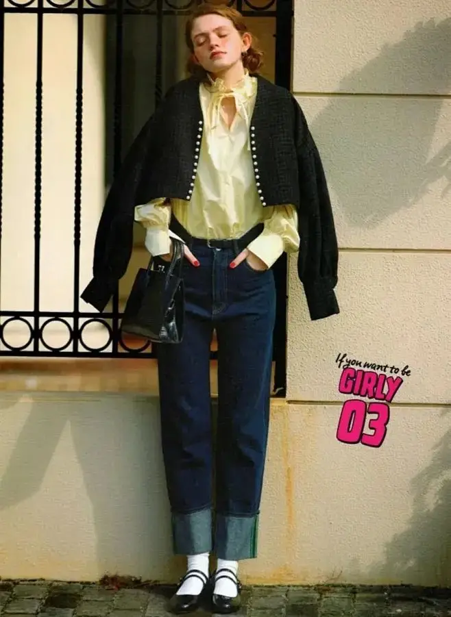 浅黄色衬衫与藏蓝色牛仔裤的组合,黄的明亮与藏蓝的稳重,形成一种视觉上的平衡。