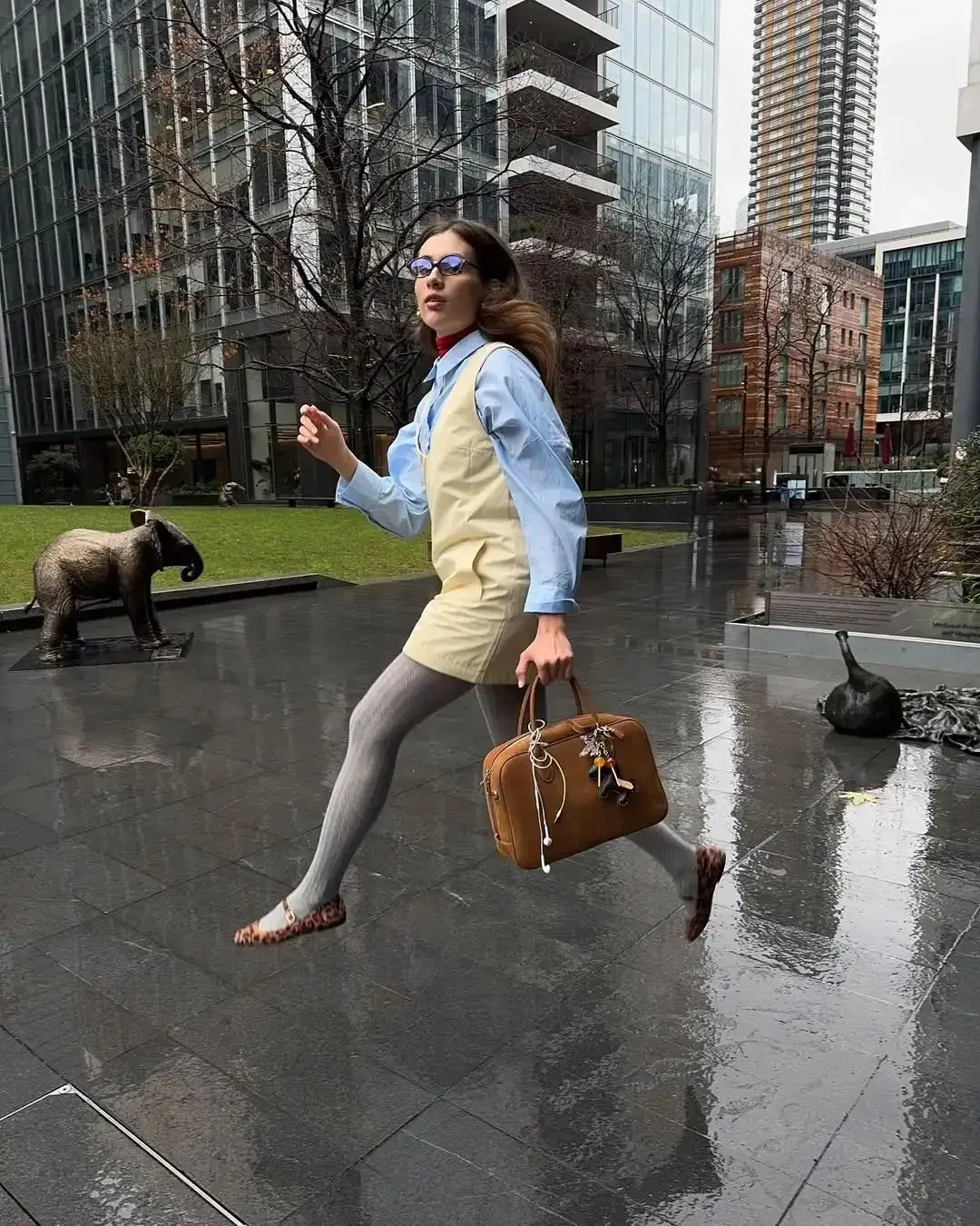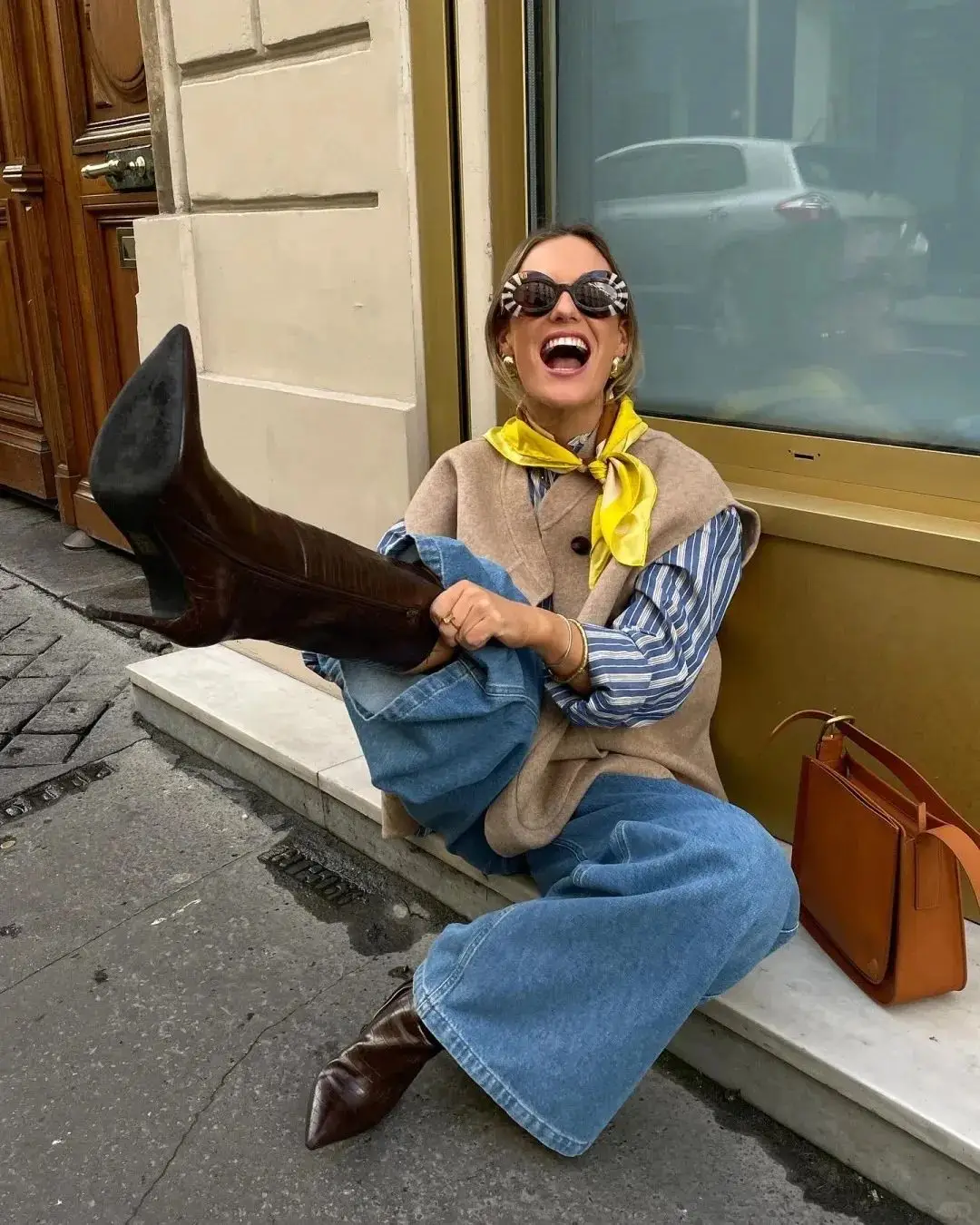 黄色马甲在春日可以叠穿蓝色条纹衬衫,在下半身配一条巧克力色阔腿裤中和一下,不会显得过于跳脱。