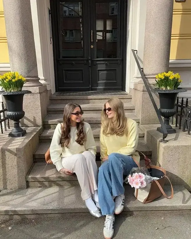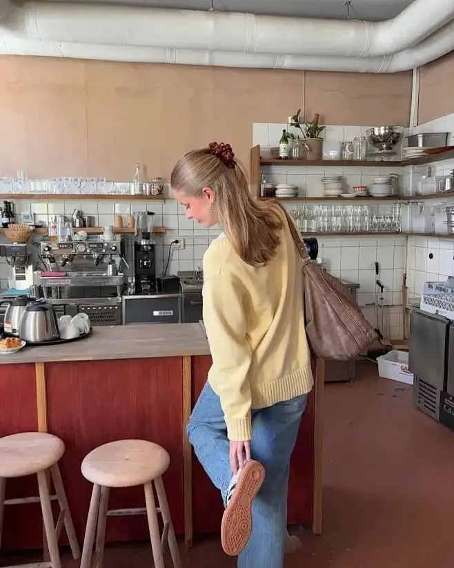 浅黄色毛衣搭配复古蓝牛仔裤是一个很有春天的感觉的搭配。