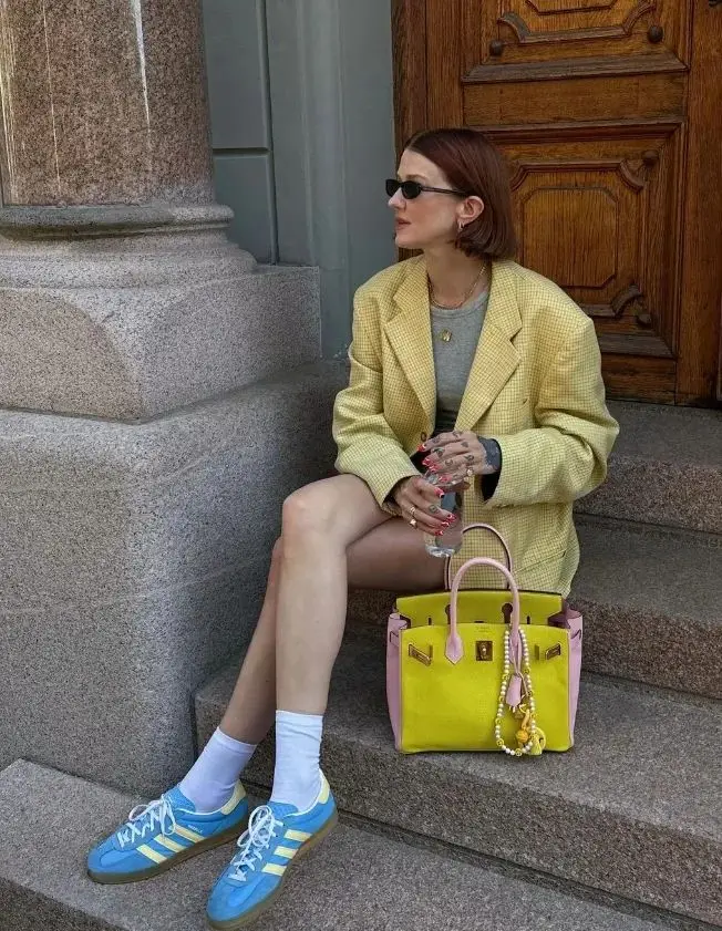 黄色西装、裙子搭配蓝色运动鞋是一个很好的例子,这样的搭配不仅能够打破单调,还能增添一丝轻松休闲的感觉。