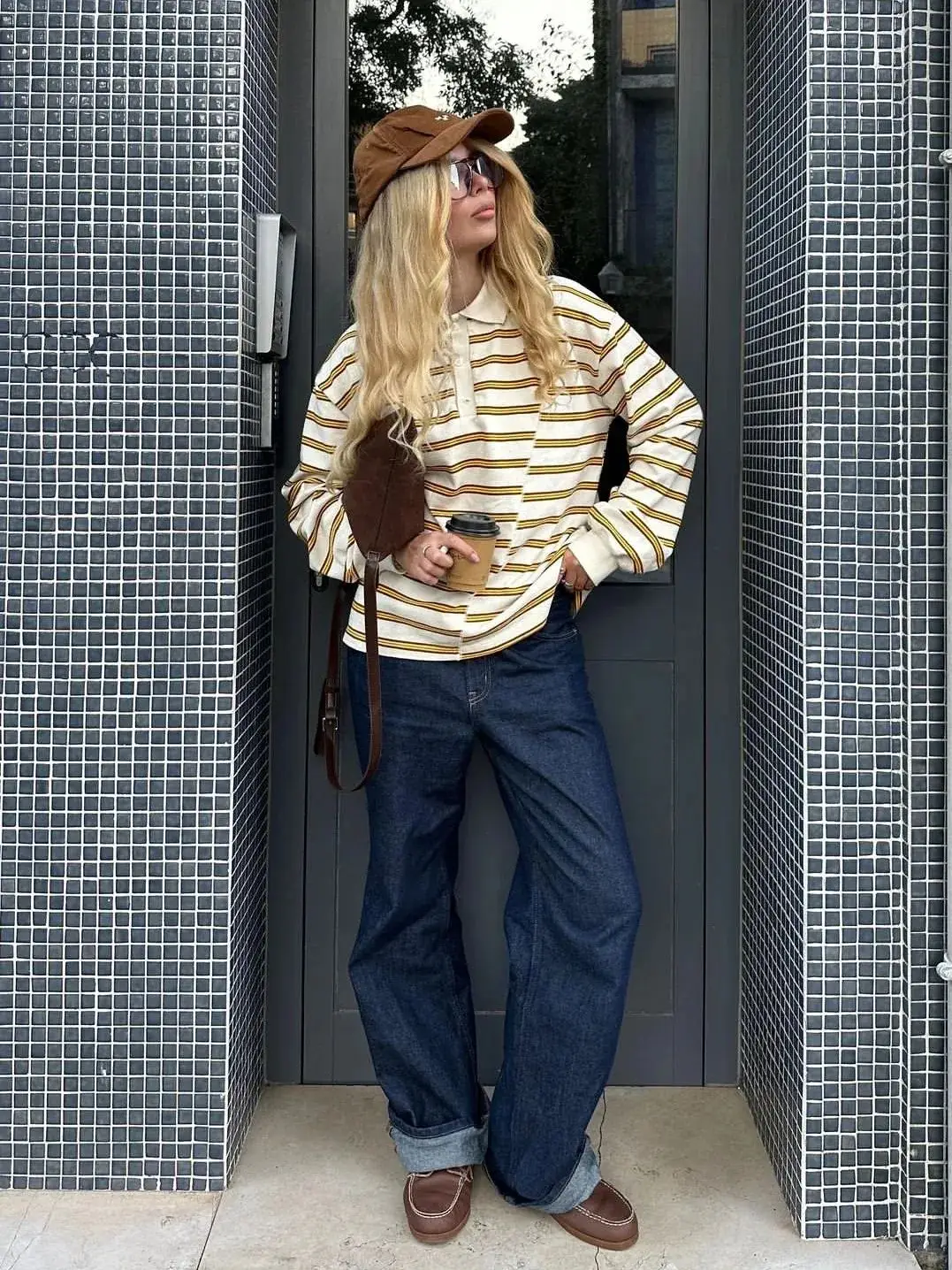 浅黄色条纹POLO衫既休闲又不失格调,搭深蓝色牛仔阔腿裤,深蓝色与浅黄色形成对比,但不会过于突兀在,再搭配与整体色调相协调的棕色乐福鞋、棒球帽、包包点缀。