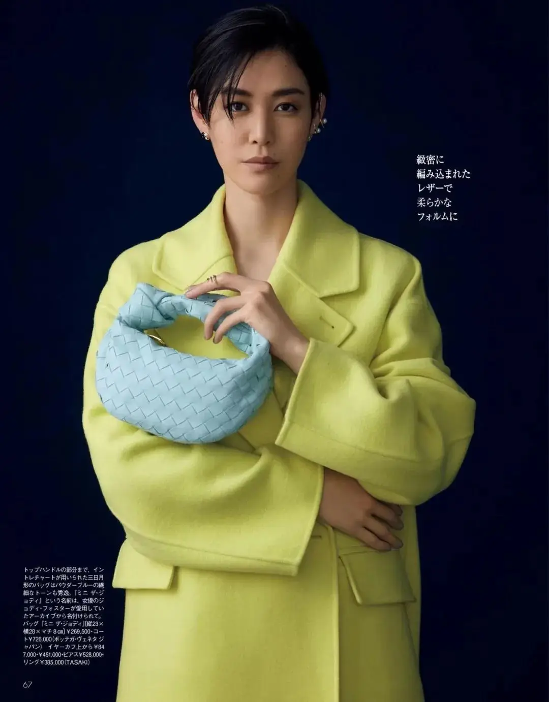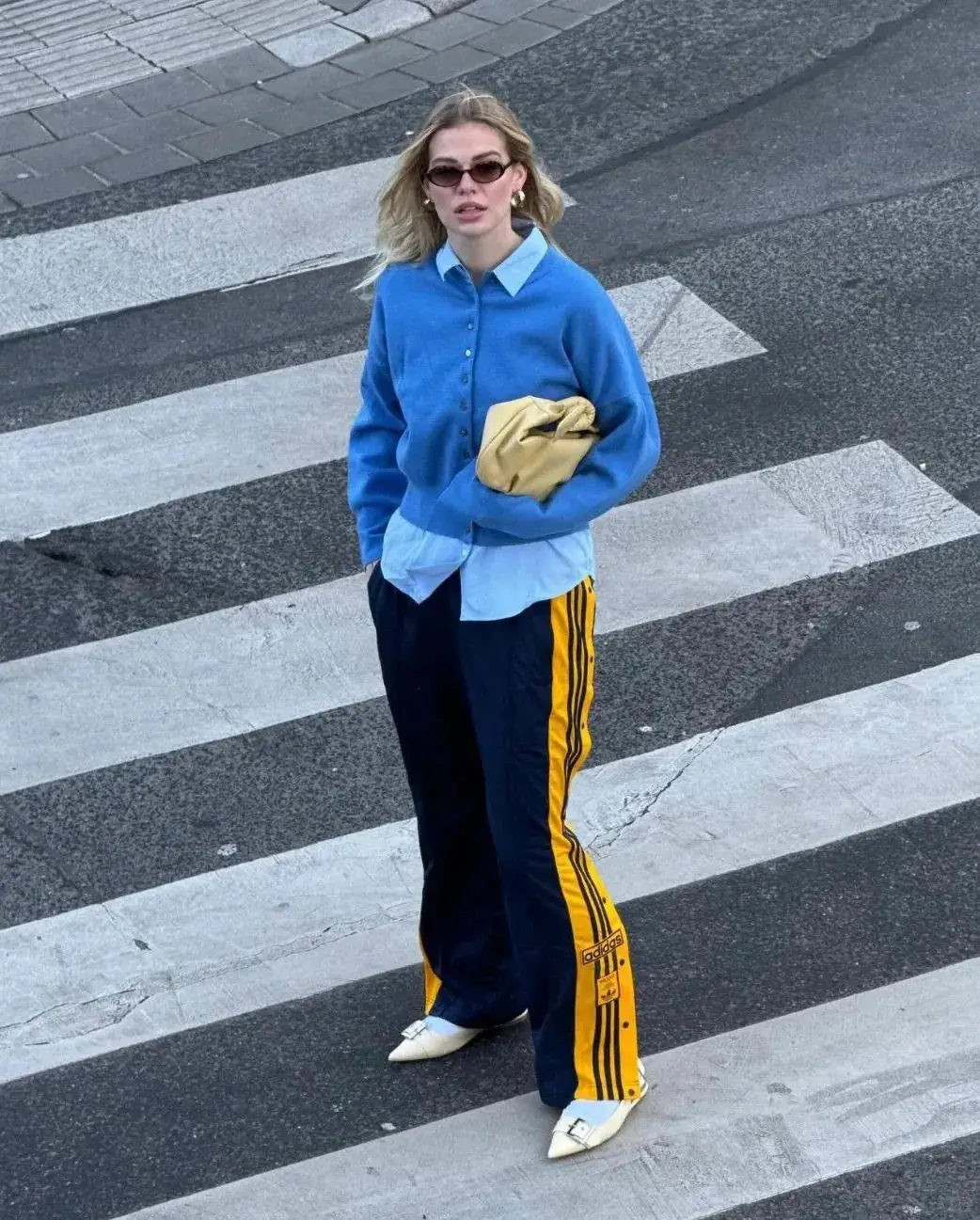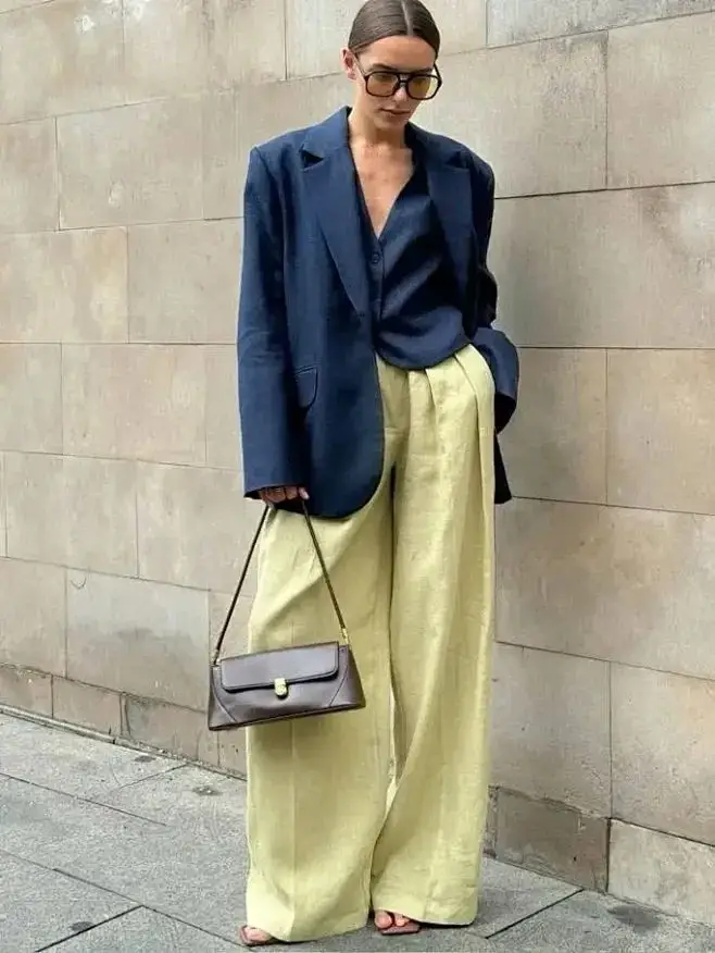 大面积穿浅黄色时,搭配蓝色小件单品可以形成鲜明的撞色效果,这样的搭配既时尚又充满活力。