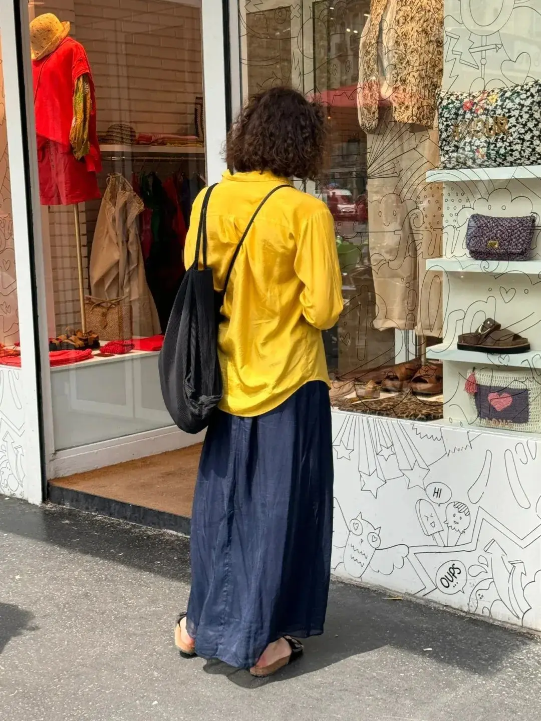 姜黄色衬衫搭配藏蓝色A字裙,再加上一双凉拖,整体上会呈现出一种明亮而清爽的春夏日风情。