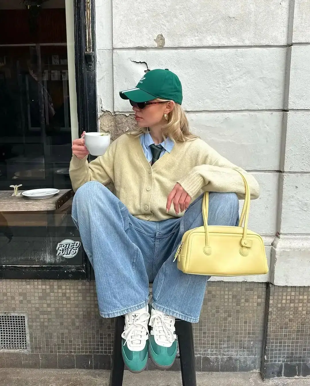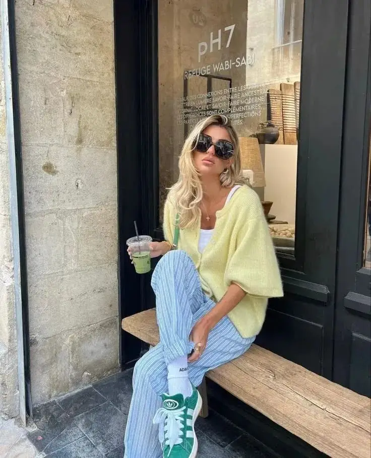 浅黄色针织开衫搭配蓝色衬衫,下身的牛仔裤与蓝色衬衫相呼应,搭配绿色运动鞋与棒球帽,相互呼应,为整体造型增添了一抹亮色,同时也带来一丝运动休闲的气息。