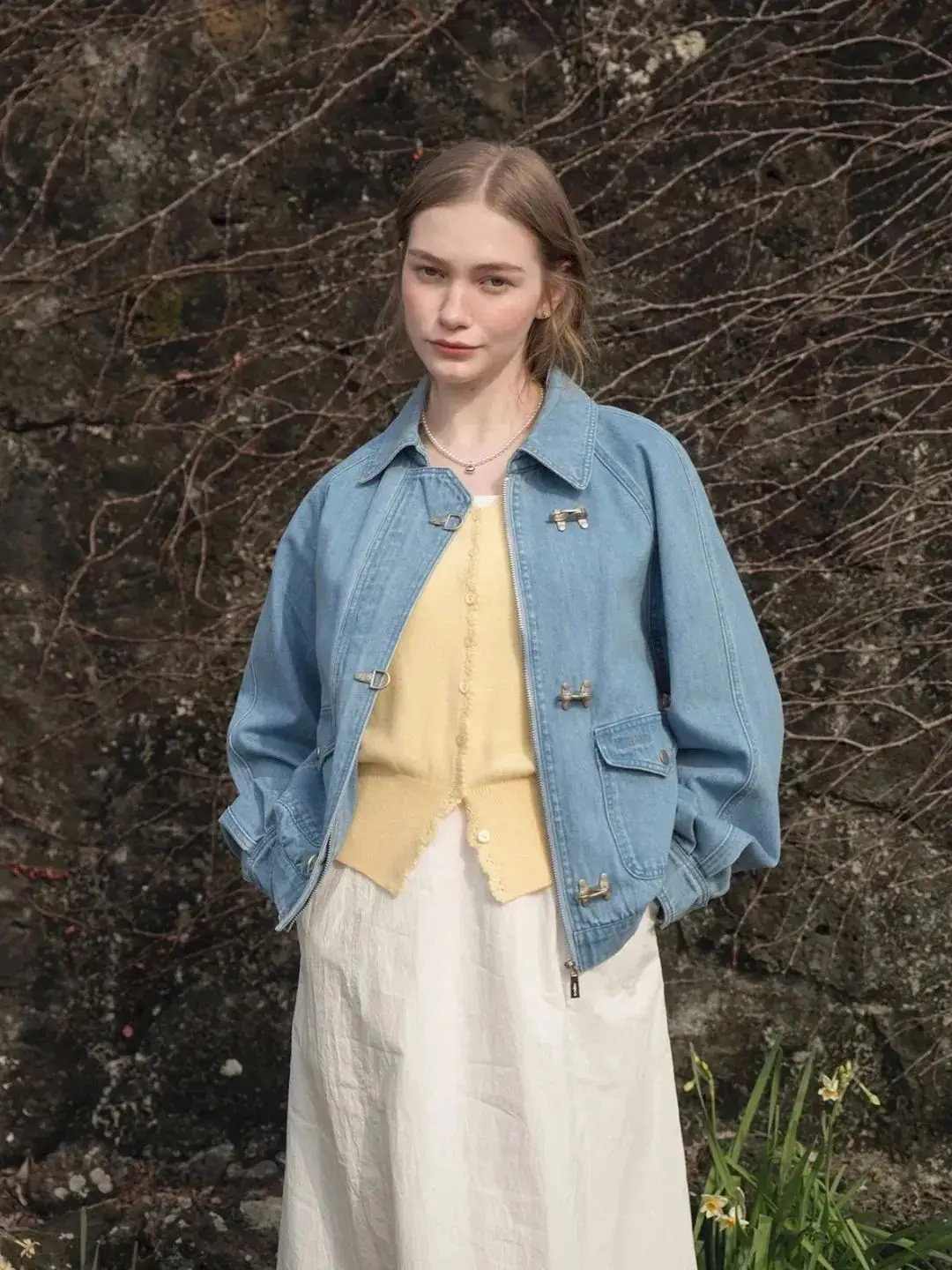 换成浅蓝色牛仔裤,整体色调会显得更加清爽轻盈。