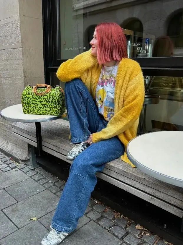 选择一件姜黄色针织开衫,内搭一件白色T恤衫过渡,这样既能突出姜黄色开衫的温暖感,又能保持整体造型的清爽,与下身的复古蓝形成反差。