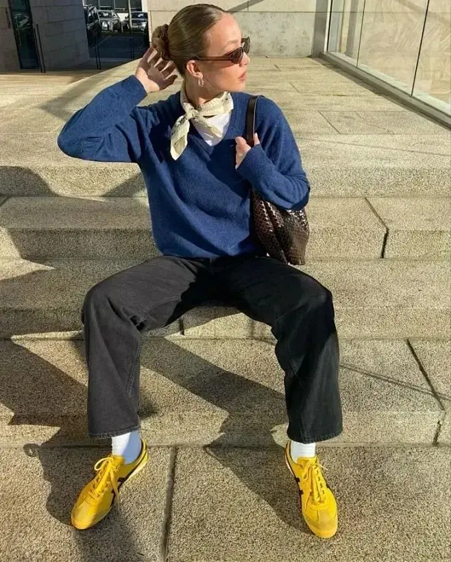 选择一条设计简洁、颜色鲜艳的黄色丝巾,避免过于复杂的图案,以免与蓝色毛衣产生杂乱感。再穿一双黄色运动鞋,增加整体的活力感。