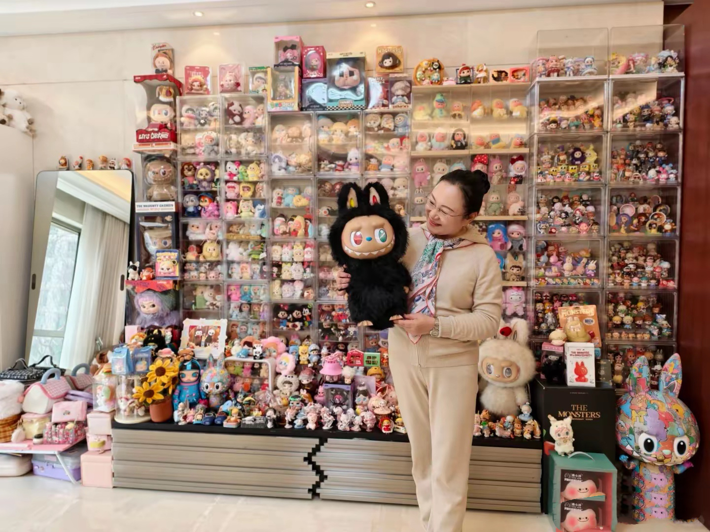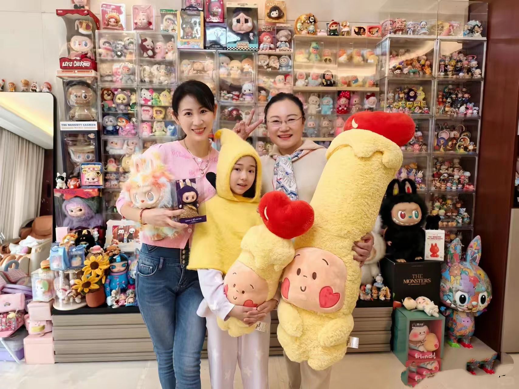 拿到小酒窝礼物的老师也是非常开心,也许老师不是很喜欢拉布布,但这是小朋友的心意。在这样的手办墙面前拍照,真的是很震撼。
