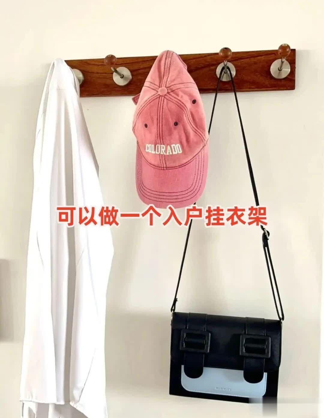 用长条实木边角料做主体,打磨光滑后刷上和入户门搭配的颜色,在木板上钉上几个金属挂钩,固定在入户墙面,做成简易挂衣架,用来挂外套、包包、钥匙、雨伞,入户瞬间变整洁,再也不用乱堆乱放。