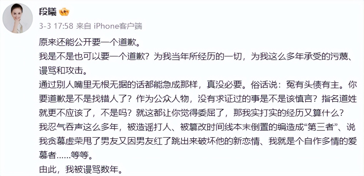 更关键的是,在他们尚未分手期间,张杰就与谢娜在一起了,网友却将段曦当作破坏两人感情的第三者,致使她多年来承受着网络暴力的折磨,如今她也要借此机会讨个说法。