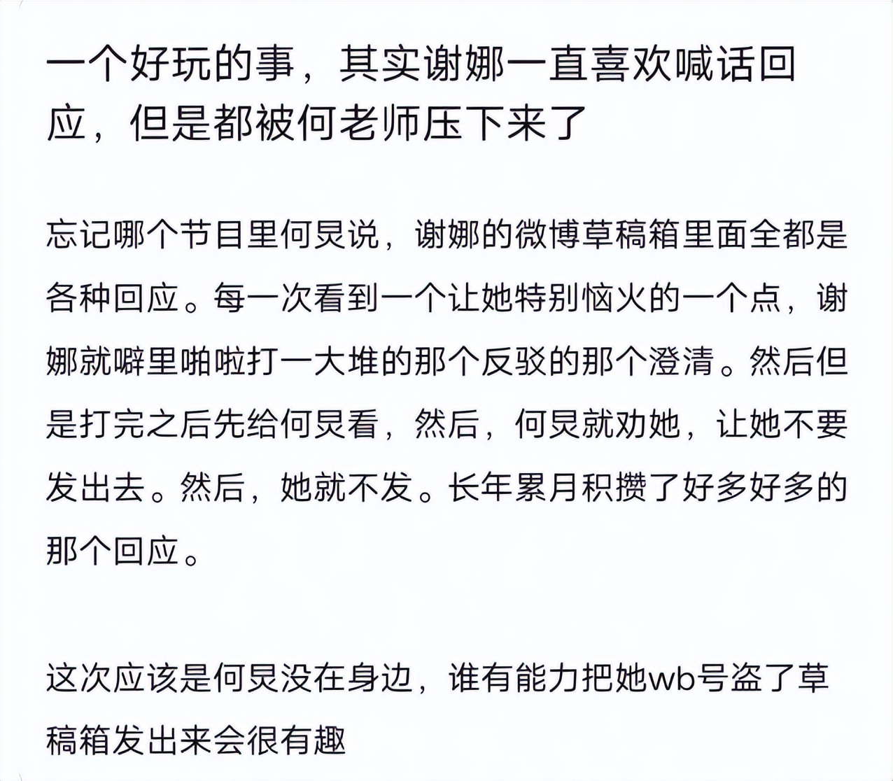 以前在节目中何炅曾透露,谢娜很喜欢喊话回应,她的微博草稿箱里全是未发出的文章。