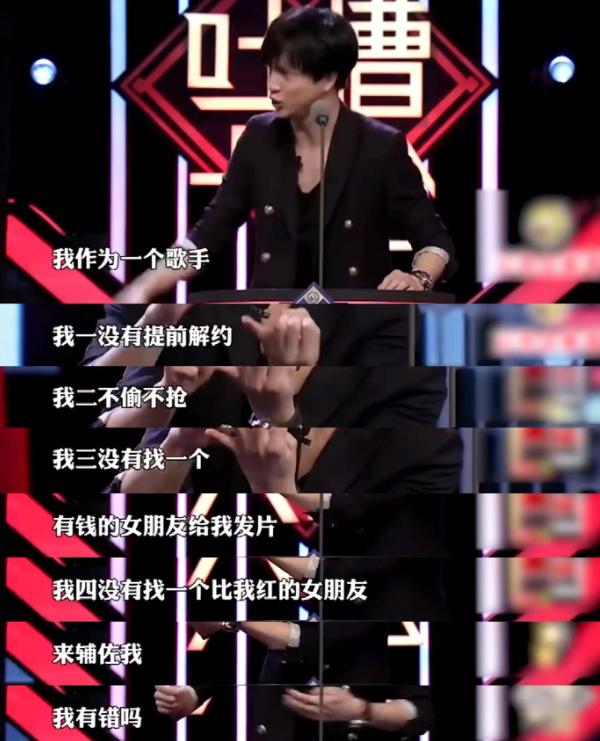 前者在《吐槽大会》上提到:“我作为一名歌手,一没有提前解约,二没有偷抢行为,三没有找个有钱女友为我发圈,四没有找个比我红的女友来扶持我,我有错吗?”