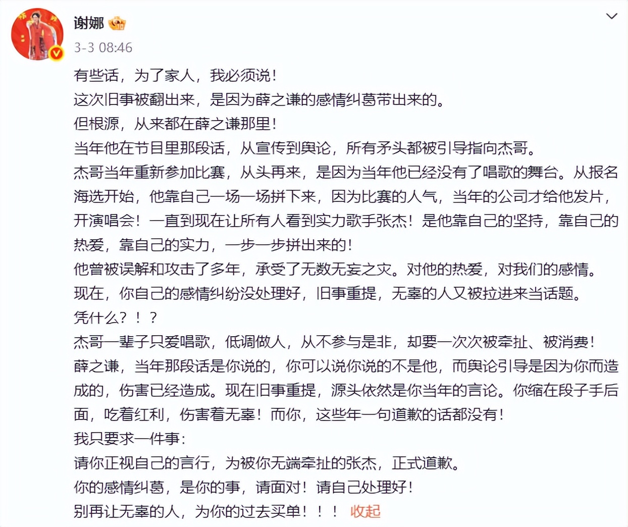 如今旧事重提,谢娜按捺不住,公开发表长文要求薛之谦道歉。