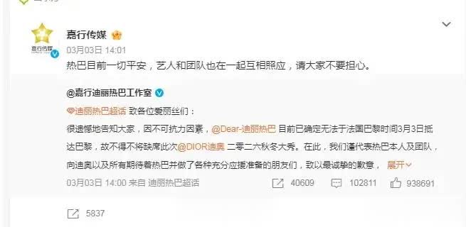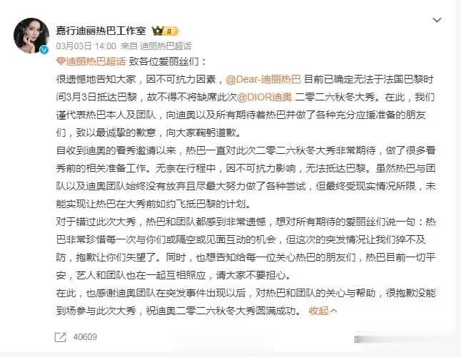 迪奥官方表态“安全重于商业活动”,强调不影响后续合作,各大品牌商业也纷纷恭喜迪丽热巴平安,她的后援会在巴黎街头投屏致谢粉丝支持。