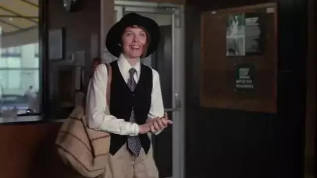 于是有了这一幕经典的”银幕女文青鼻祖”形象:黛安·基顿穿着 Ralph Lauren 的白衬衫,紫色圆点领带,帅气马甲加阔腿裤,“就像从诺曼·洛克威尔的画中走出一般”。